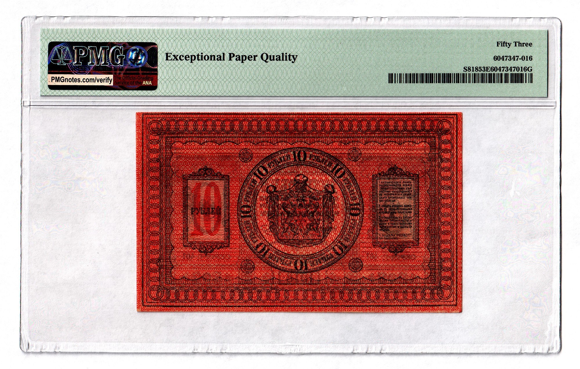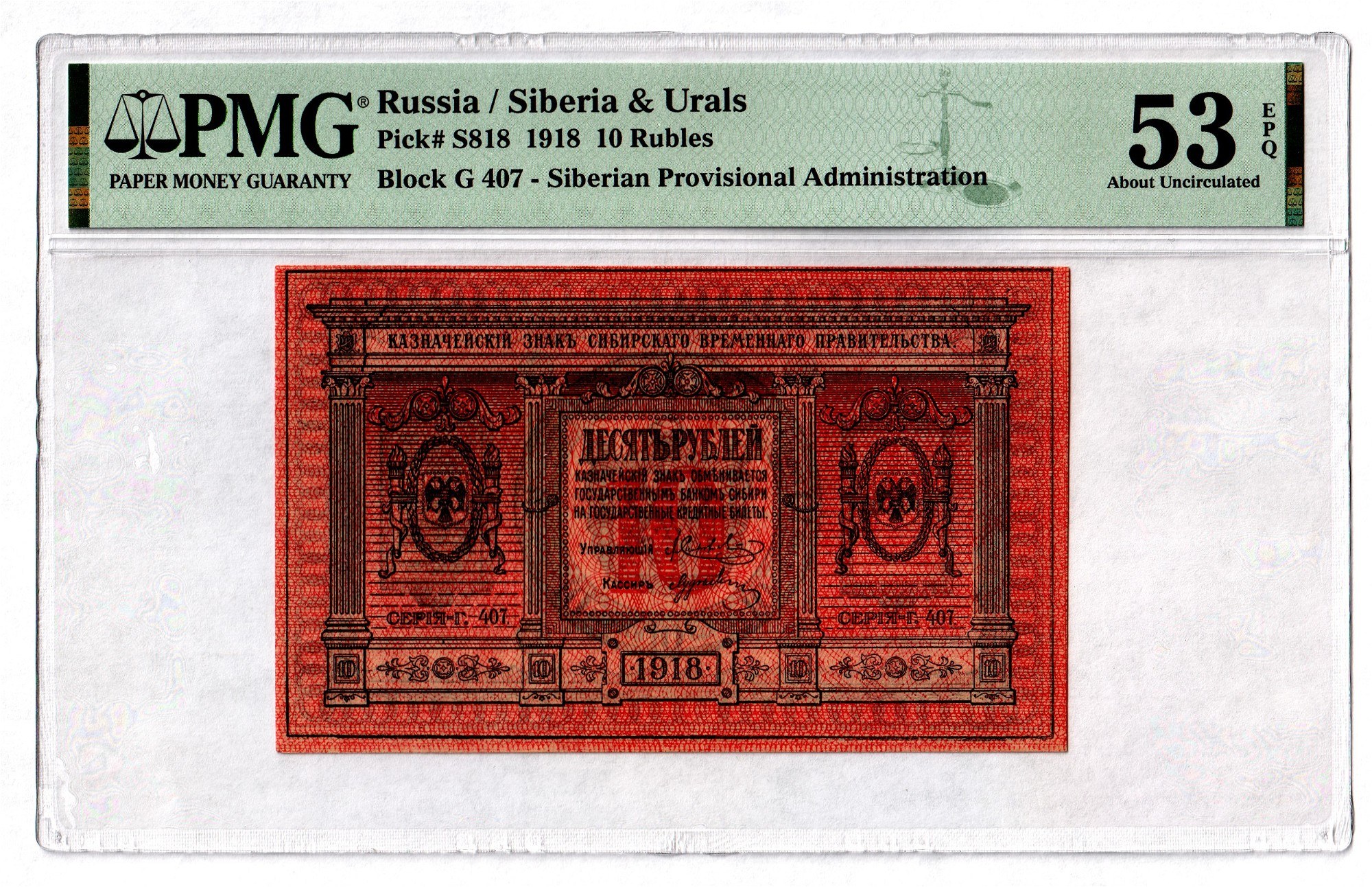 Russia - Siberia 10 Roubles 1918 PMG 53 EPQ