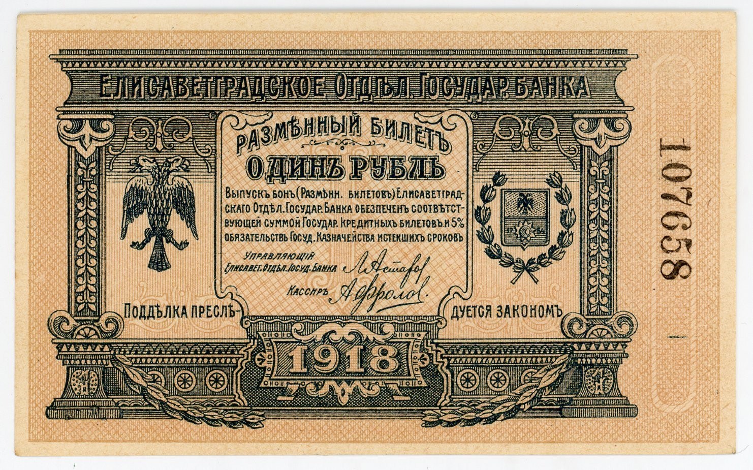Russia - Ukraine Elisavetgrad Government Bank 1 Rouble 1918