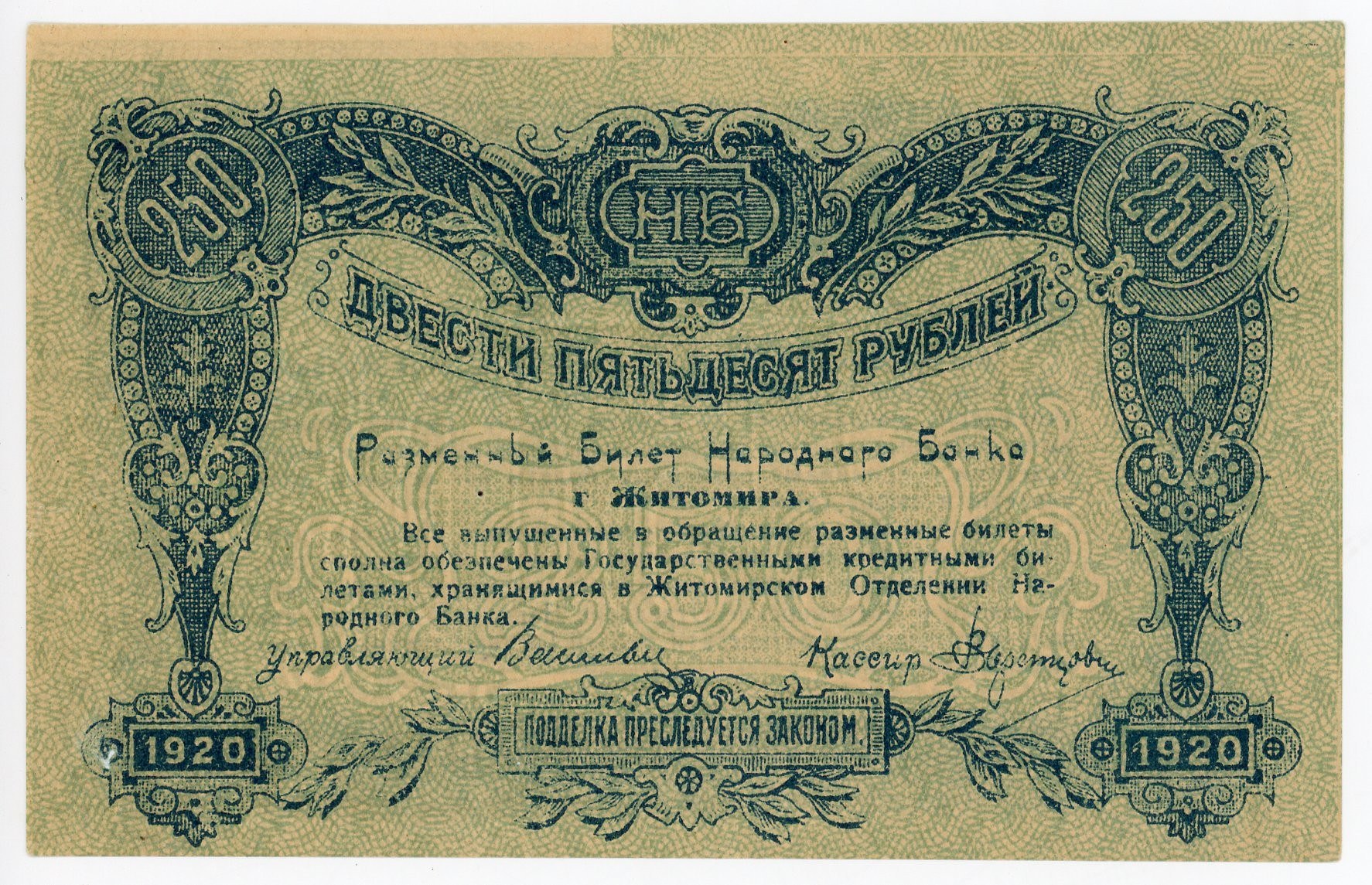 Russia - Ukraine Zhitomir Peoples Bank 250 Karbovantsiv 1919