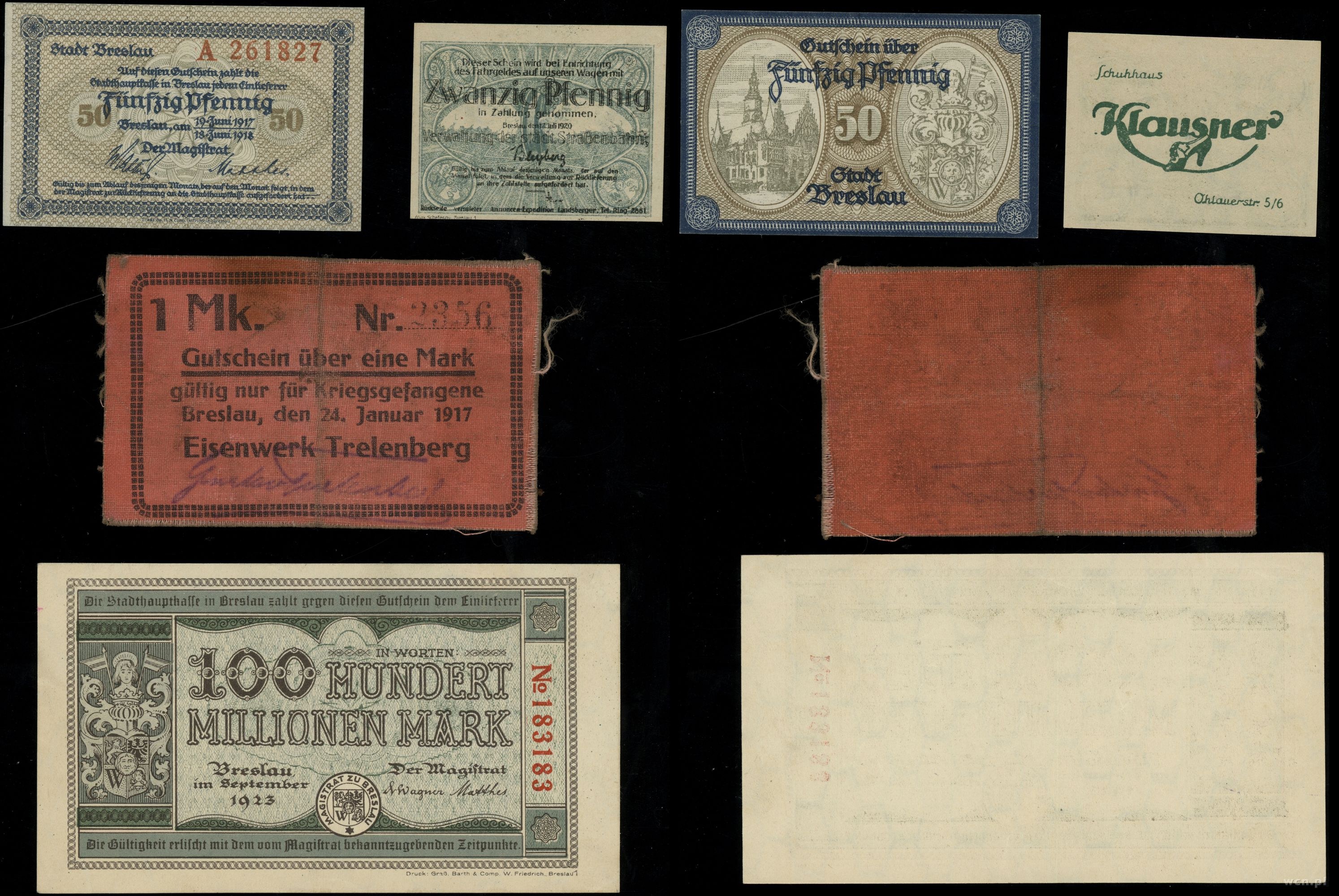 w zestawie: 100.000.000 marek 09.1923, 1 marka 24.01.1917 (druk na płótnie - stan III-), 50 fenigów 19.06.1917, 20 fenigów 12.07.1920