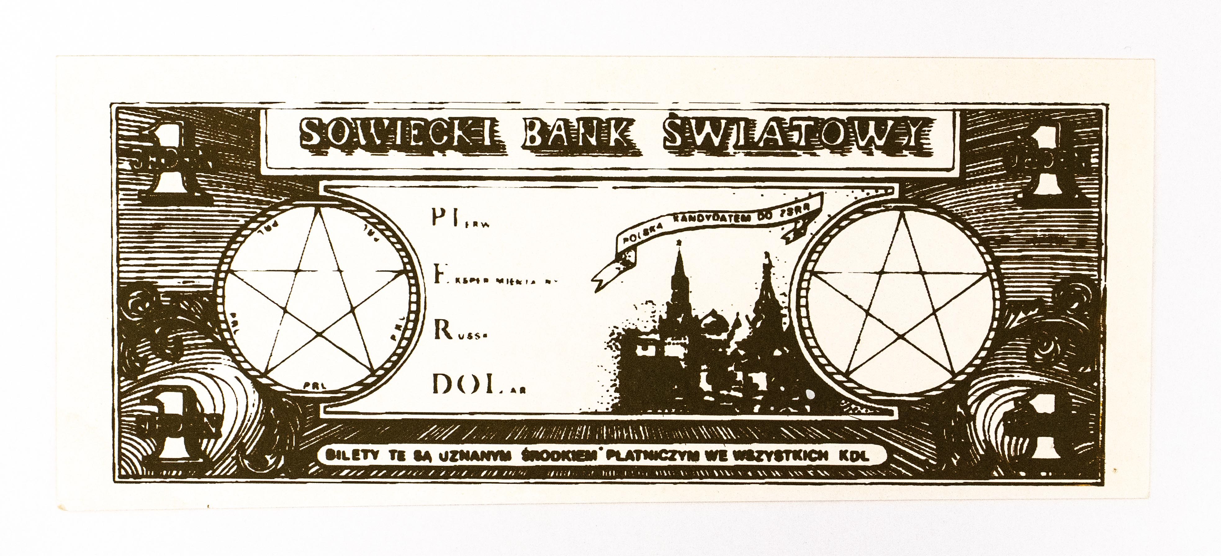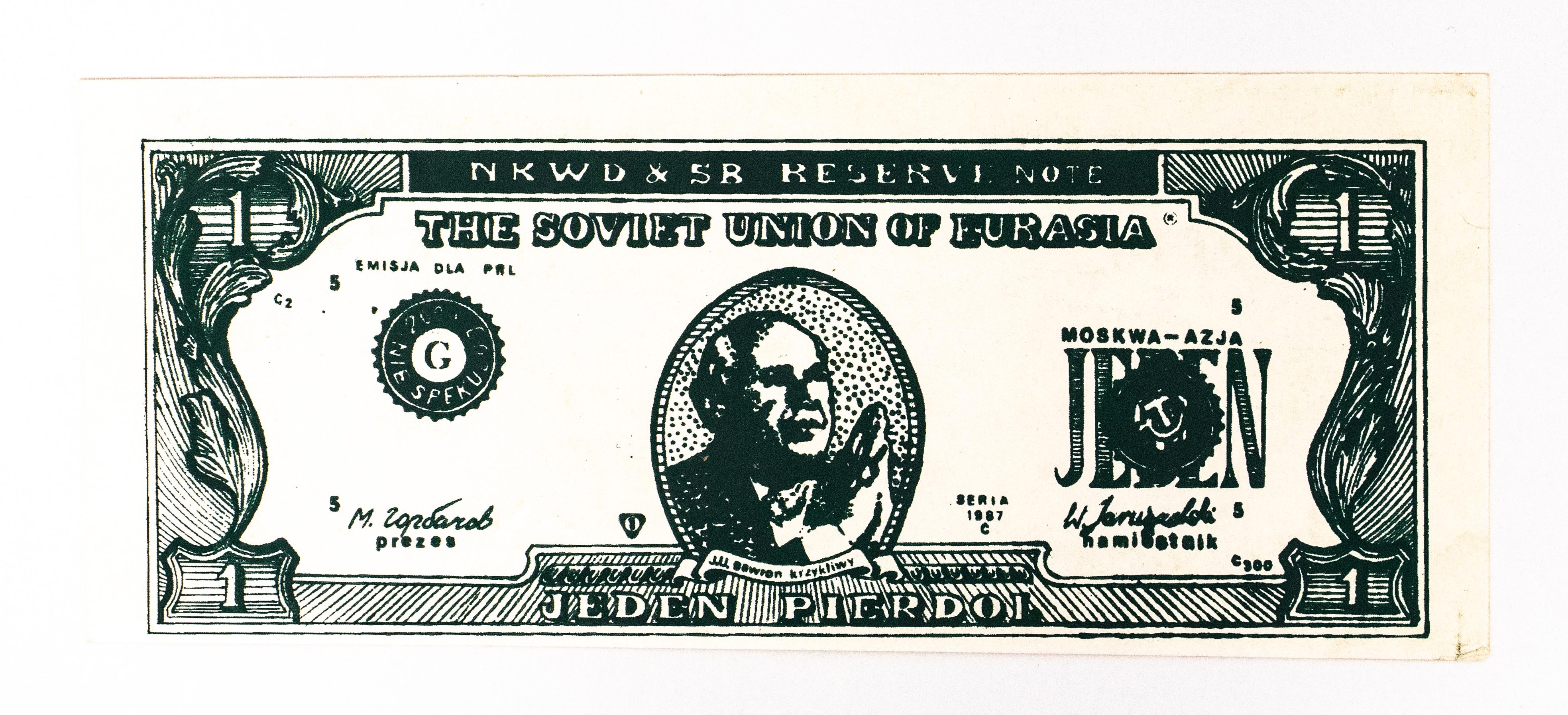 Emisja podziemna Solidarności: bon szyderczy, JEDEN PIERDOL 1987 Moskwa-Azja, seria G, Jerzy Urban, emisja dla PRL. Kolor awers ciemno-zielony, rewers czarny.
