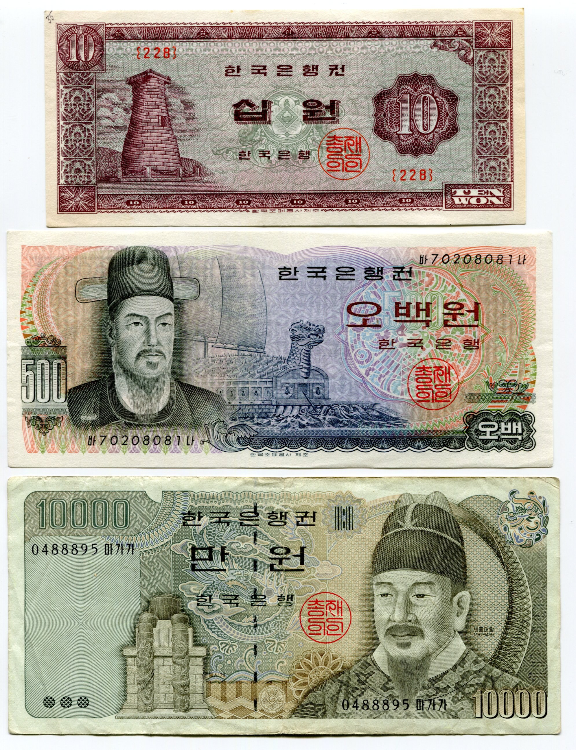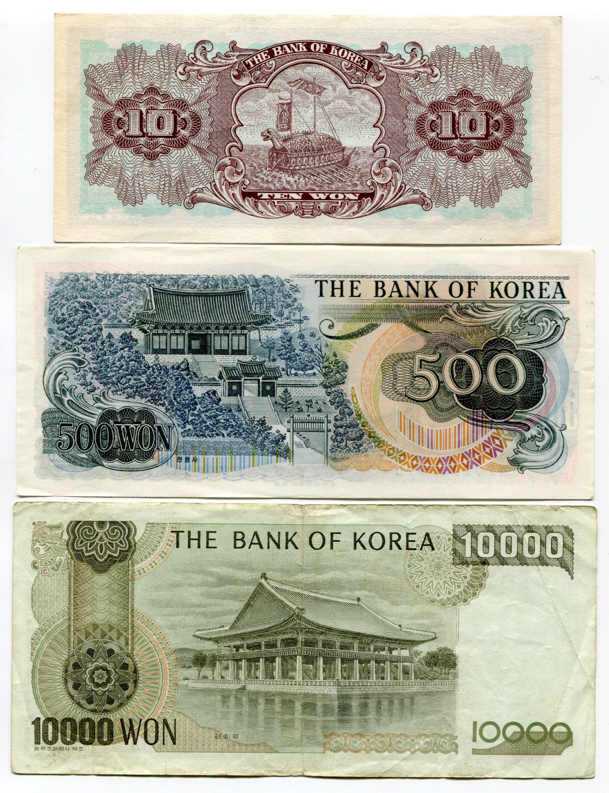 South Korea Set of 3 Notes: 10 - 500 - 10 000 Won 1962 -94