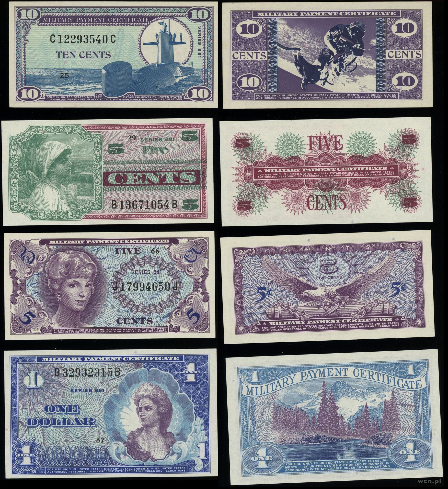 1) 5 centów (1965–1968) seria 641 2) 5 centów (1968) seria 661 3) 10 centów (1969) seria 681 4) 1 dolar (1968) seria 661