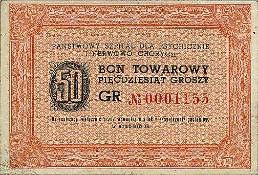 Bony towarowe szpitali dla psychicznie i nerwowochorych, Stronie Śląskie, Świecie nad Wisłą i Choroszcz: 50 groszy- Stronie Śląskie, 50 groszy- Świecie, 2 złote Choroszcz, Jabł. -, 4252, -, łącznie 3 sztuki