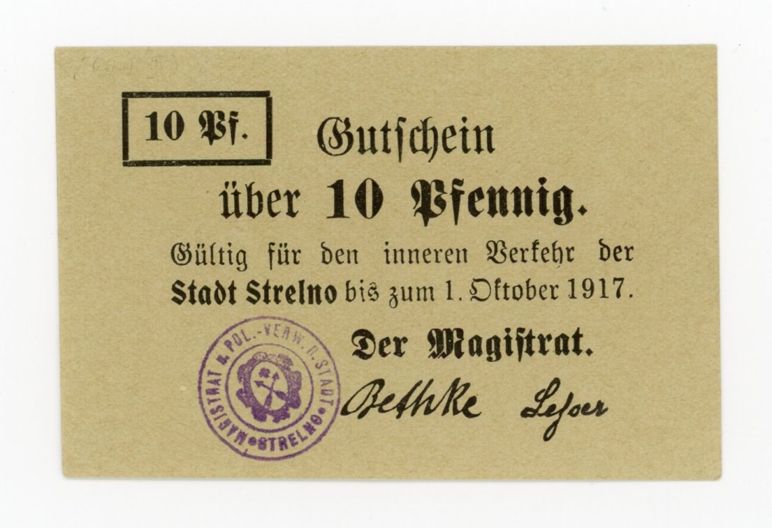 Strzelno/Strzelno, 10 fenigów 1917 - papier zielonoszary. Stan zachowania 1.