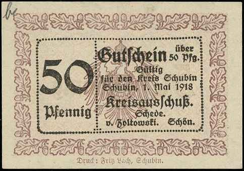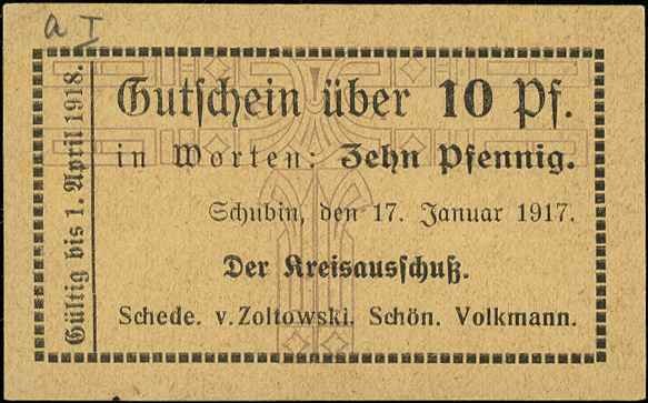 XX-wieczne banknoty zastępcze, Szubin /Schubin/, 10 i 50 fenigów 17.01.1917 oraz 10 i 50 fenigów 1.05.1918, Podczaski P-209.A.1.e, A.2.a, P-209.B.1.a, B.2, razem 4 sztuki
