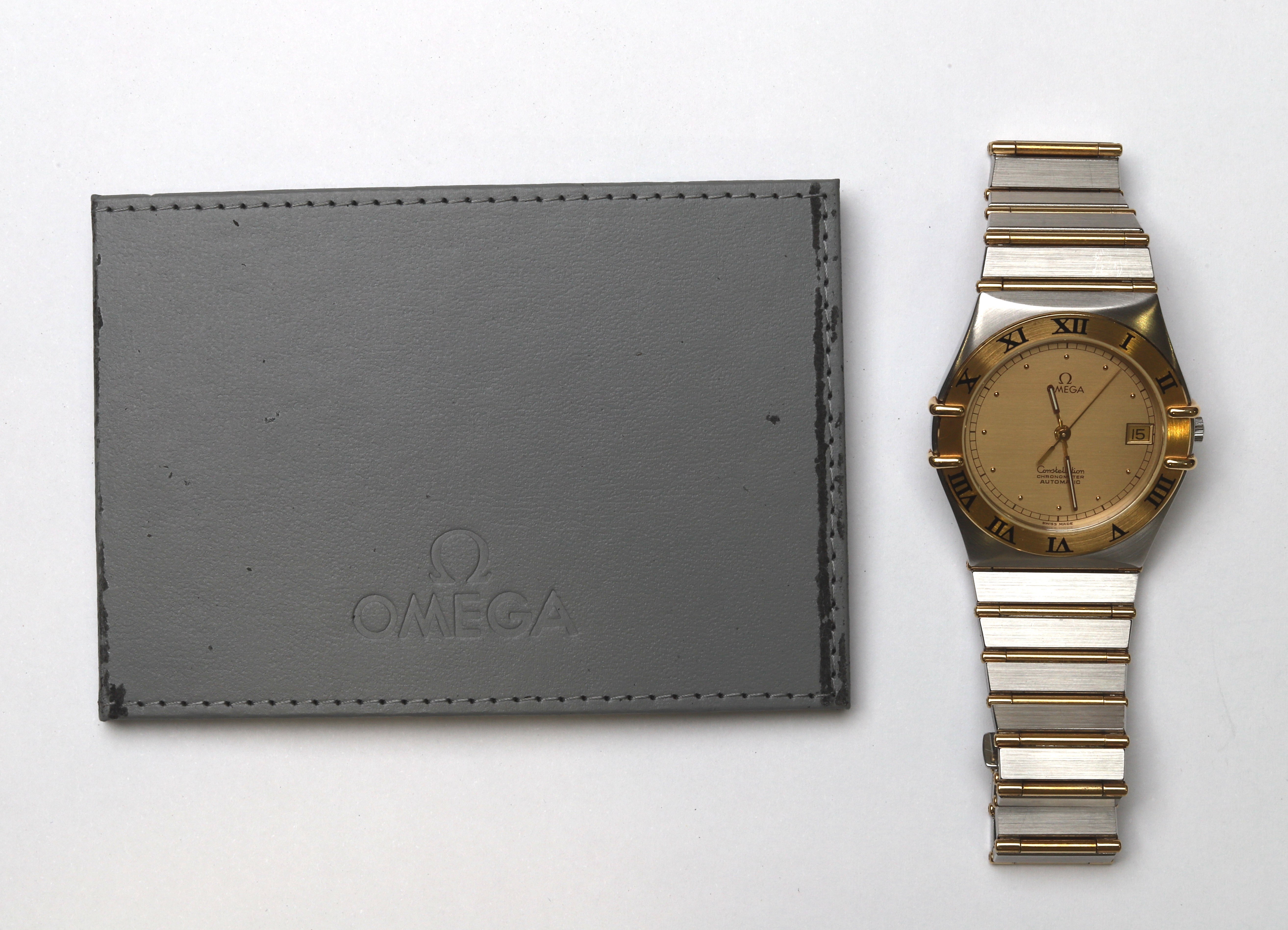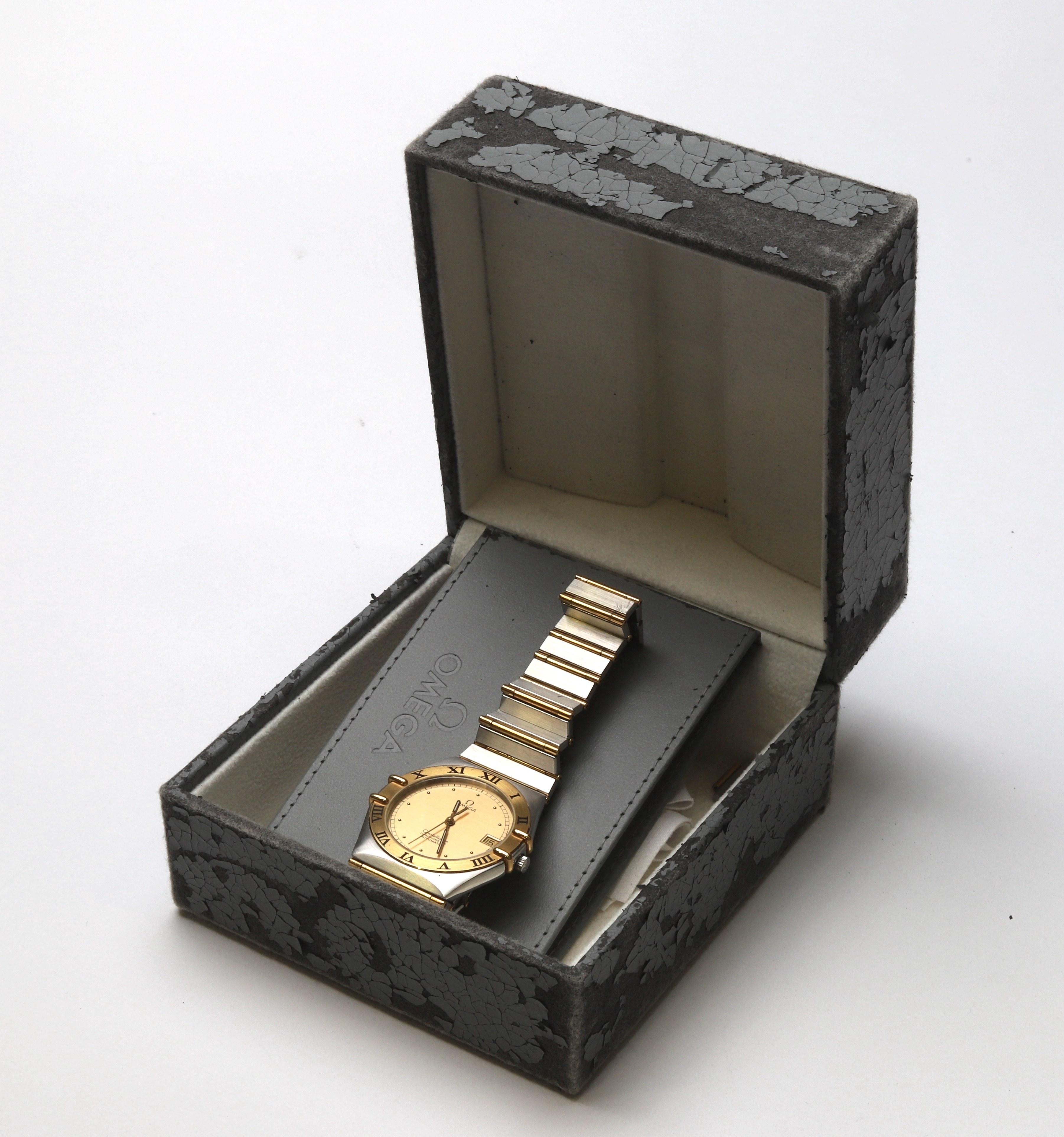 W zestawie oryginalne pudełko karta i dokumenty (brakuje tylko poduszeczki do zegarka, pudełko ma mocno uszkodzoną powłokę ochronną ze względu na upływ czasu). Zegarek z lad 90-tych XX w.