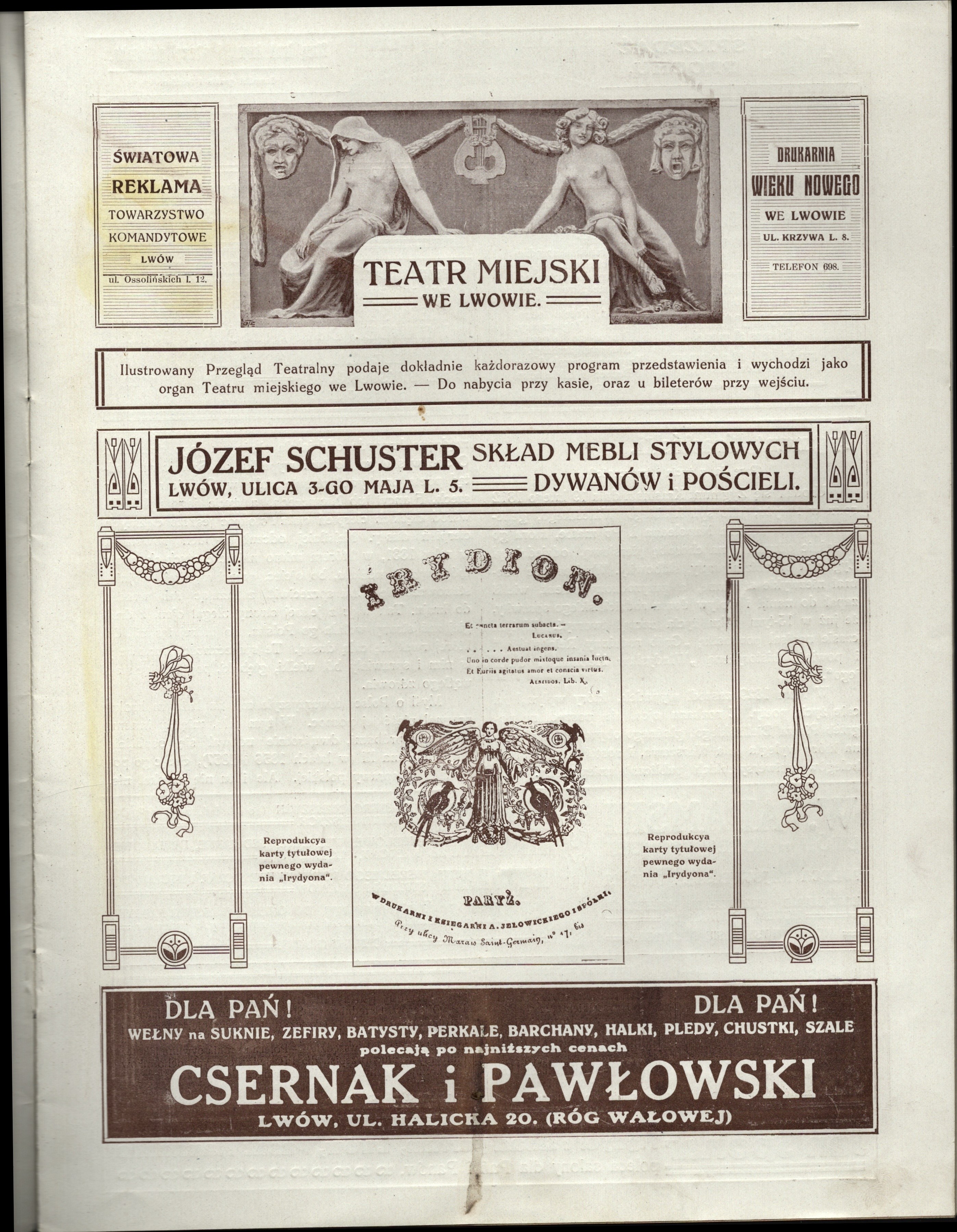 Ilustrowany Przegląd Teatralny podaje każdorazowo program przedstawienia i wychodzi i jako organ Teatru miejskiego we Lwowie.