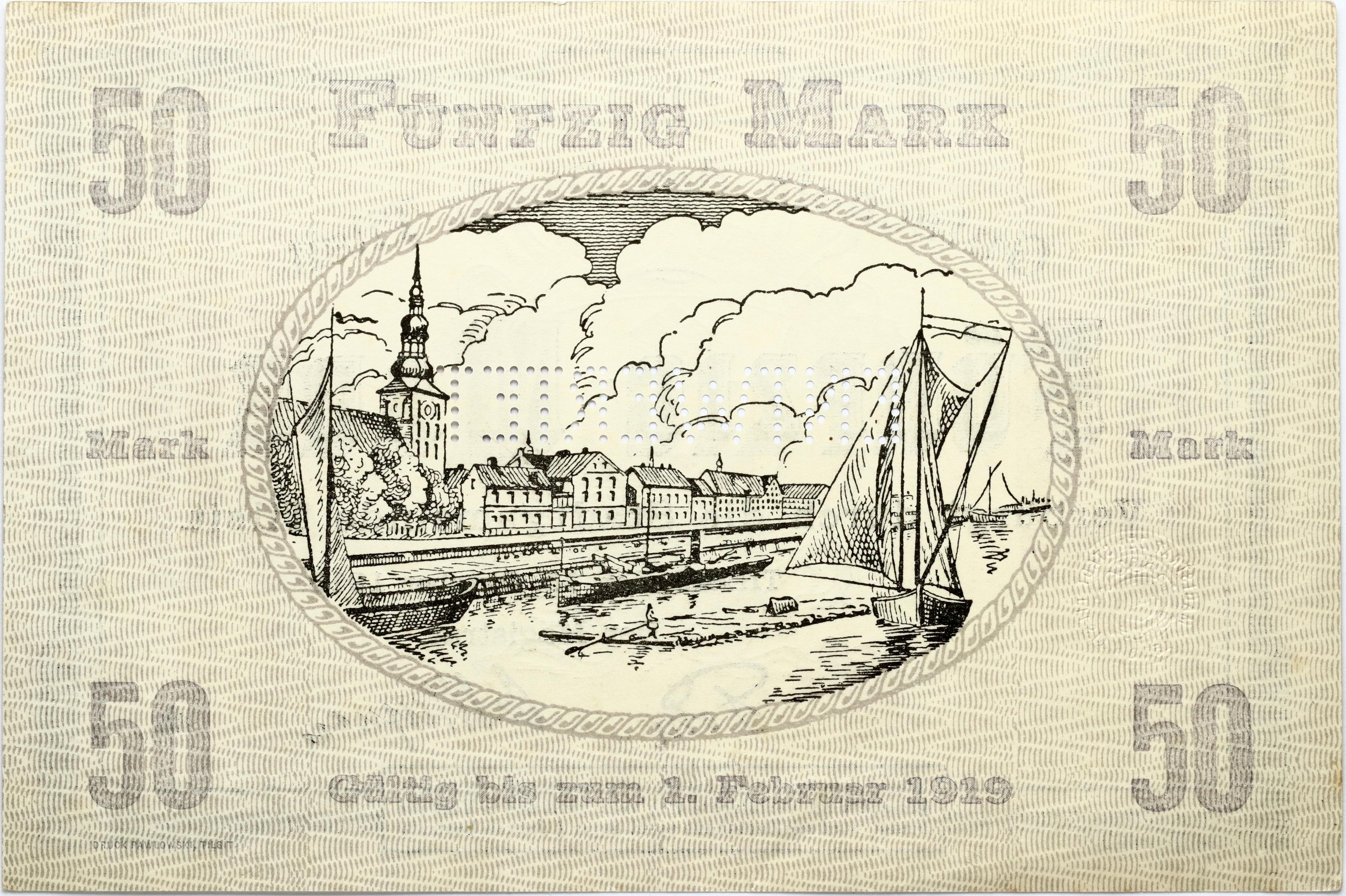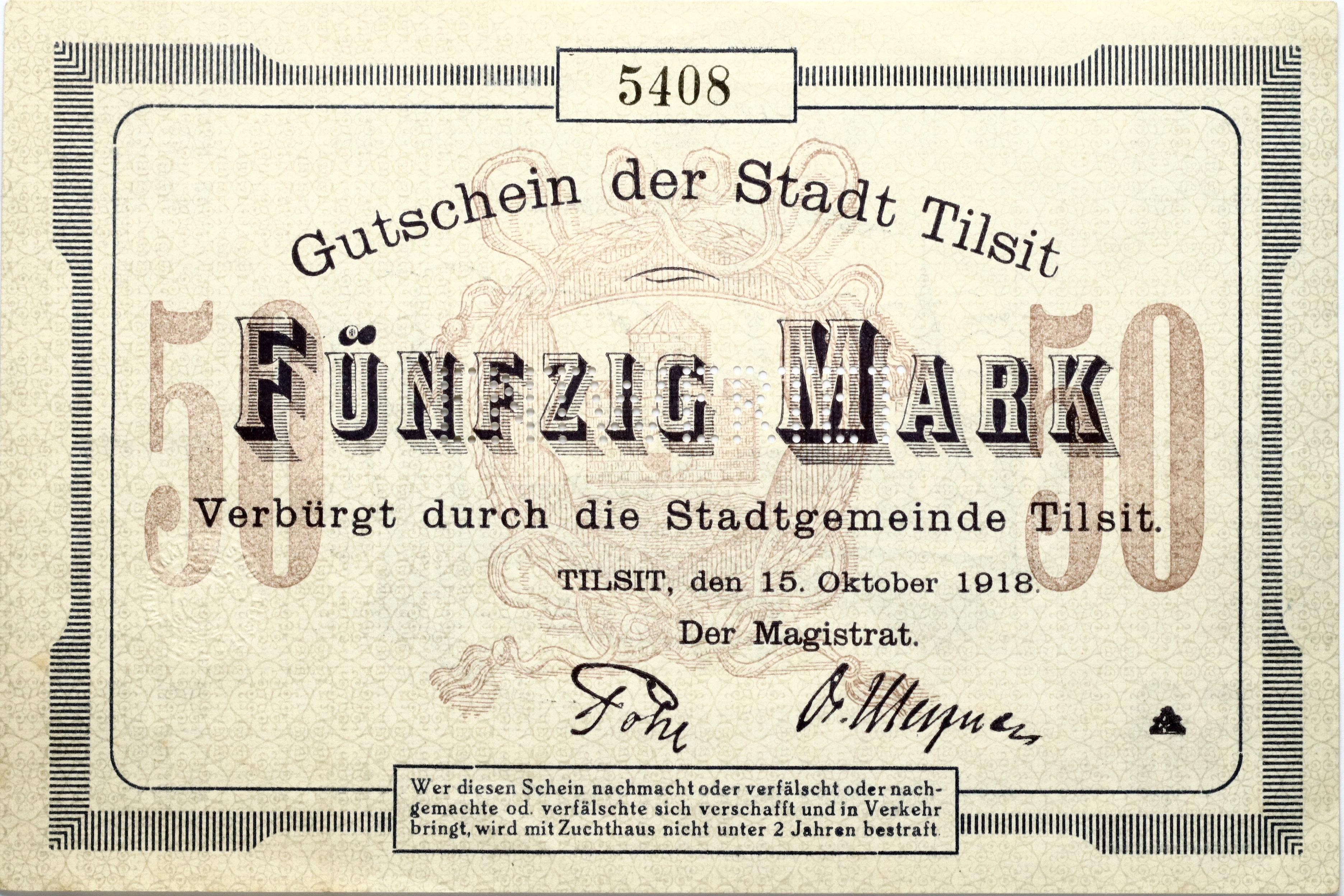 East Prussia, Tilzit (Tilze, Sovetsk). Notgeld 50 Mark 15.10.1918. S/N A 5408, perforated.