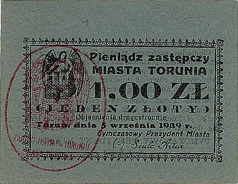 Toruń, 1 złoty 5.09.1939, emitowane przez Miasto, Jabł....