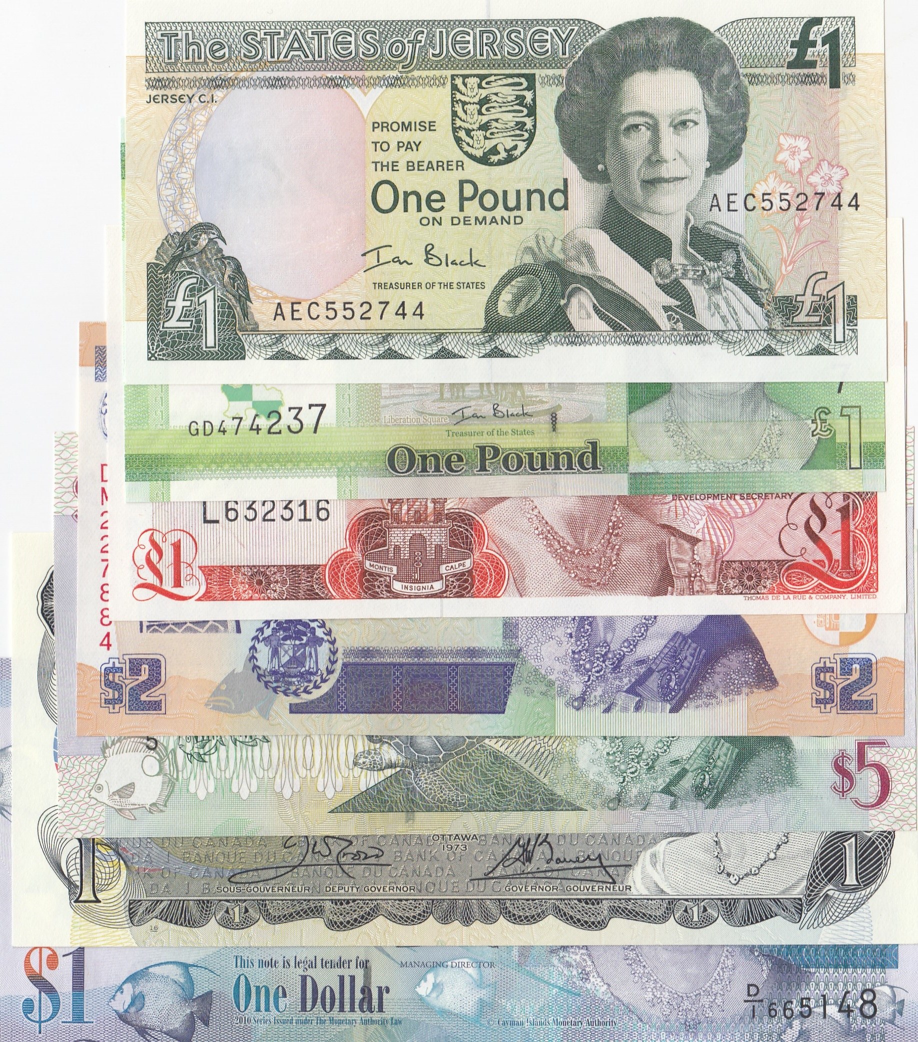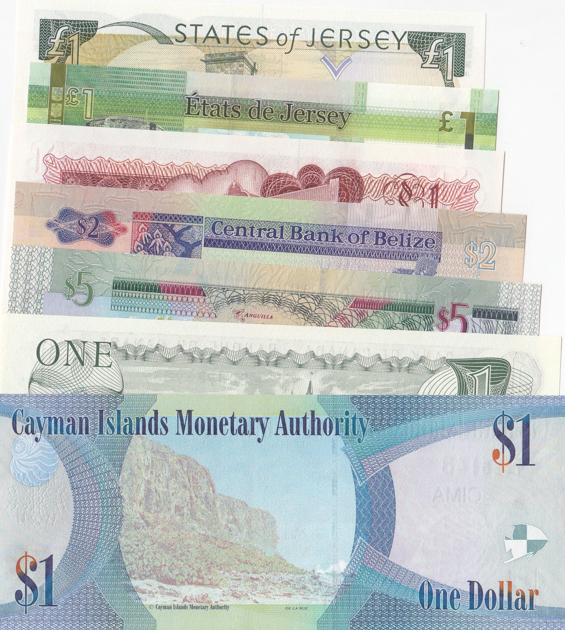 Belize, 2 Dollars, 2014, Unc, p66e, East Caribbean States, 5 Dollars, 2008, p47; Jersey 1 Pound, 2000, Unc, p26b;