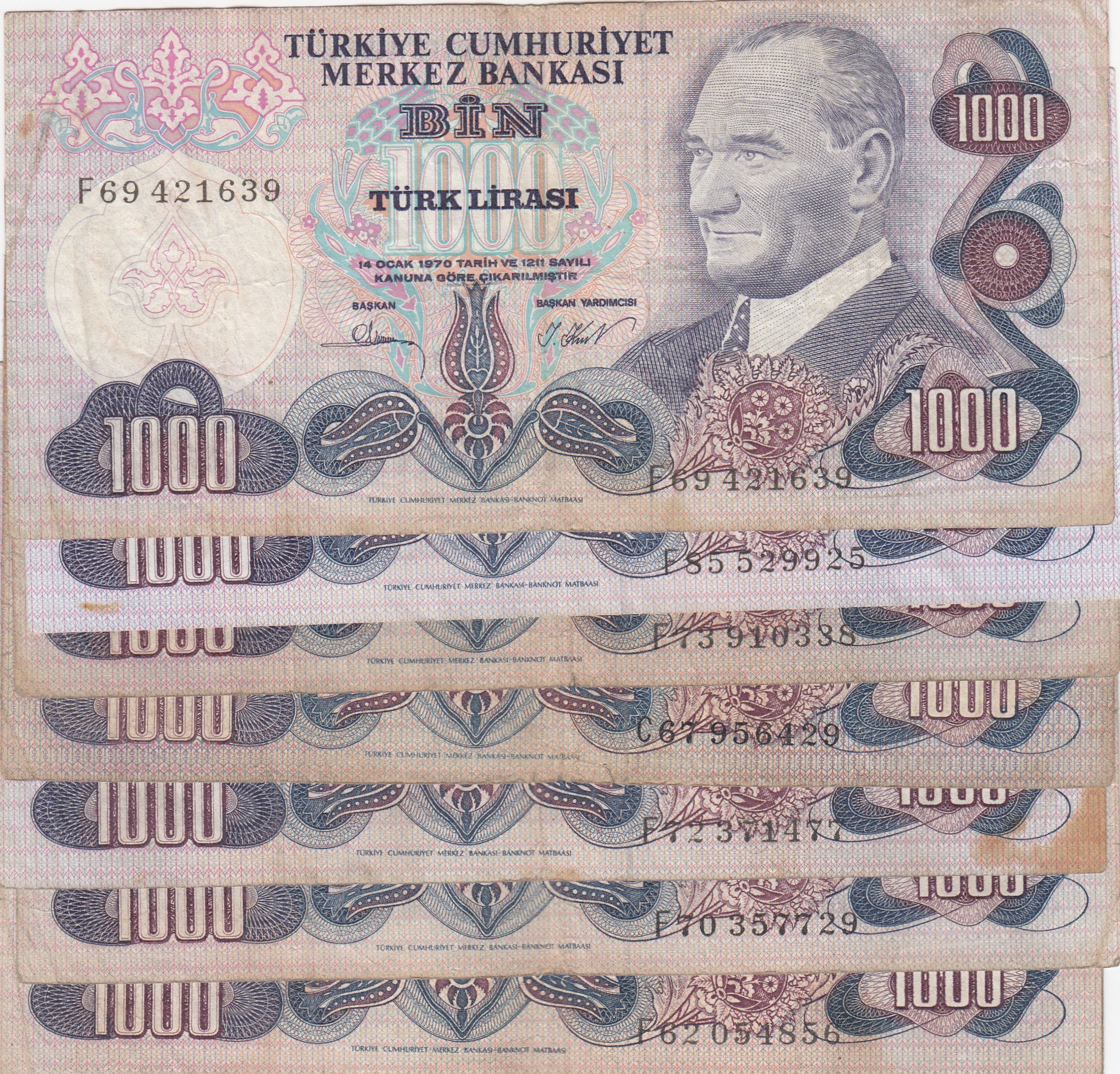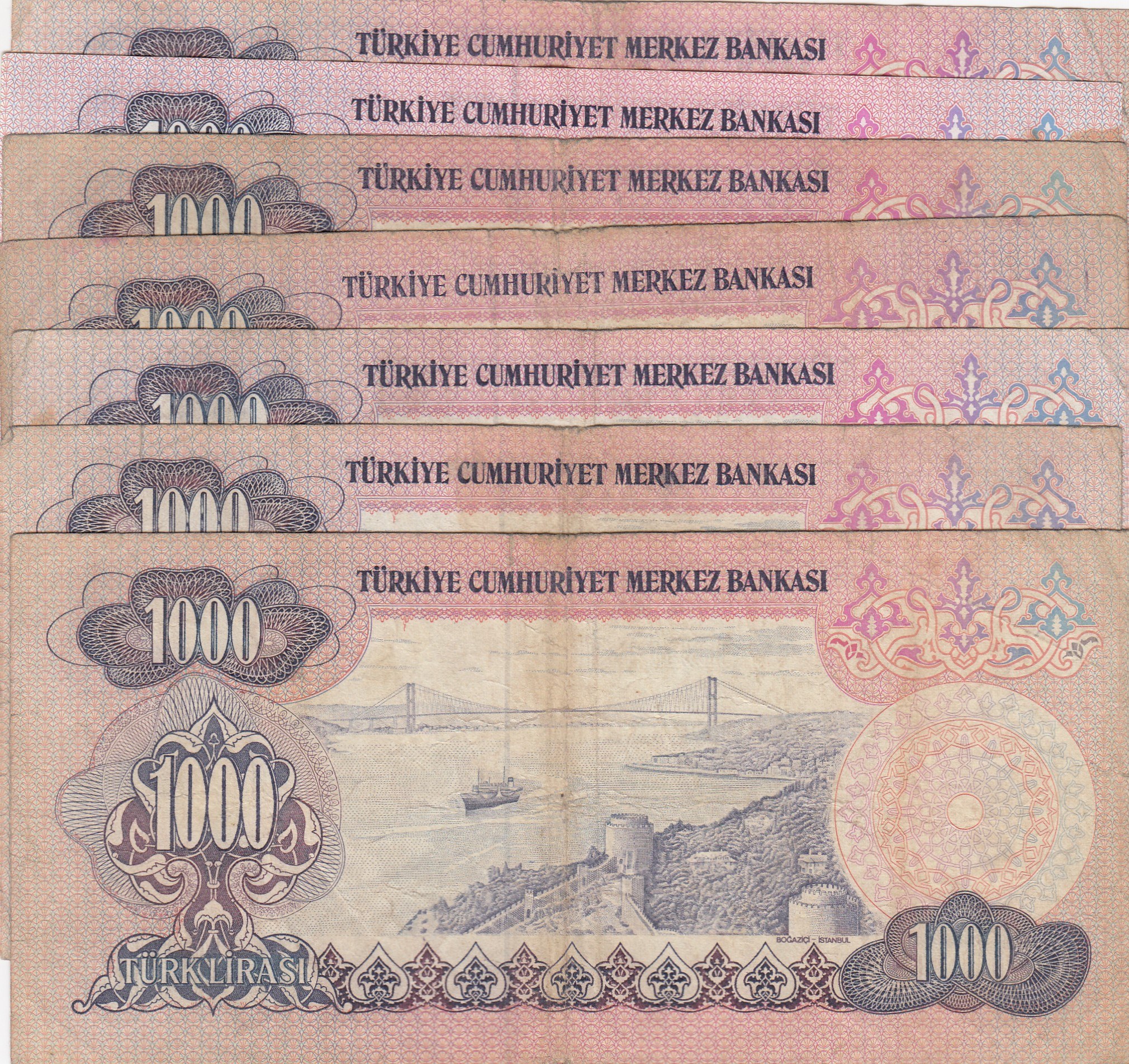 Turkey, 1.000 Lira, 1981, FINE / VF, 6/3. Emission, p191, (Total 8 banknotes)