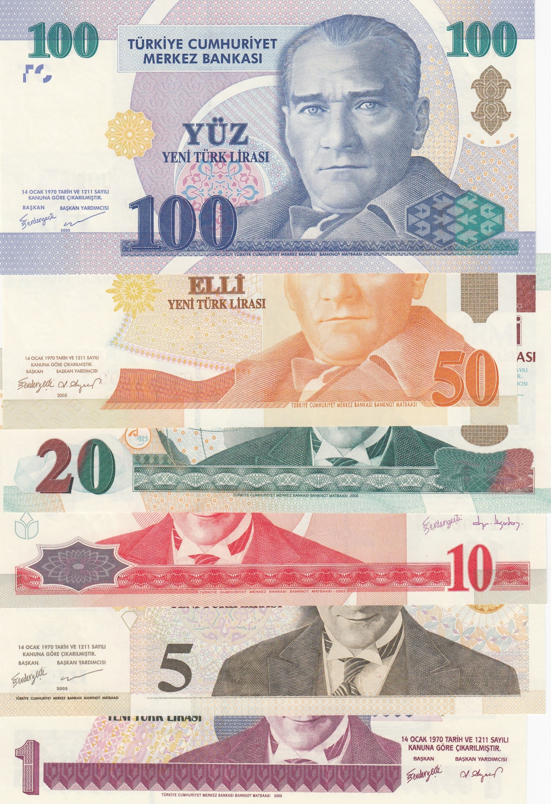 Turkey, 1 New Turkish Lira, 5 New Turkish Lira, 10 New Turkish Lira, 20 New Turkish Lira, 50 New Turkish Lira and 100 New Turkish Lira, 2005, UNC, p216 …p221, (Total 6 banknotes)