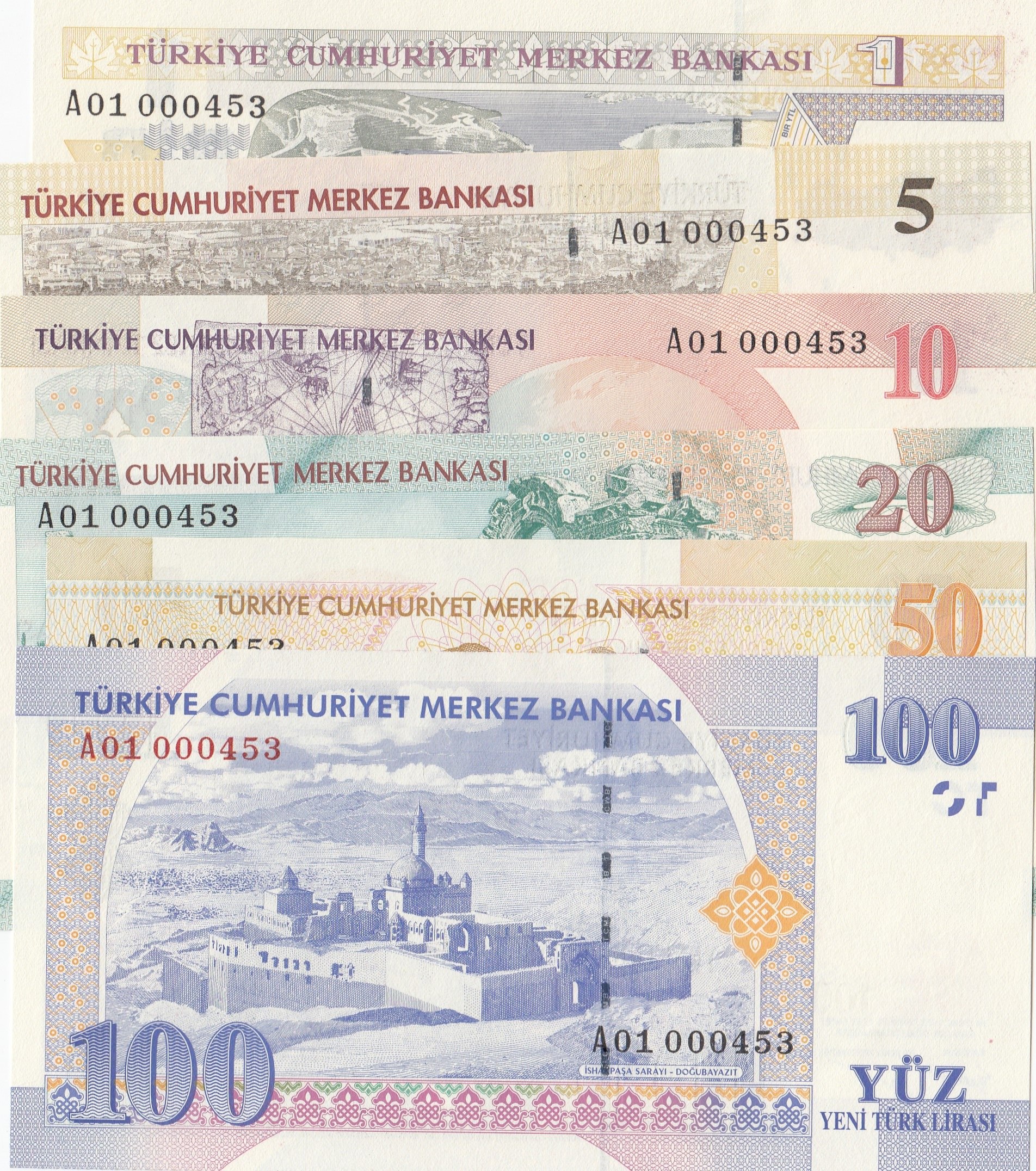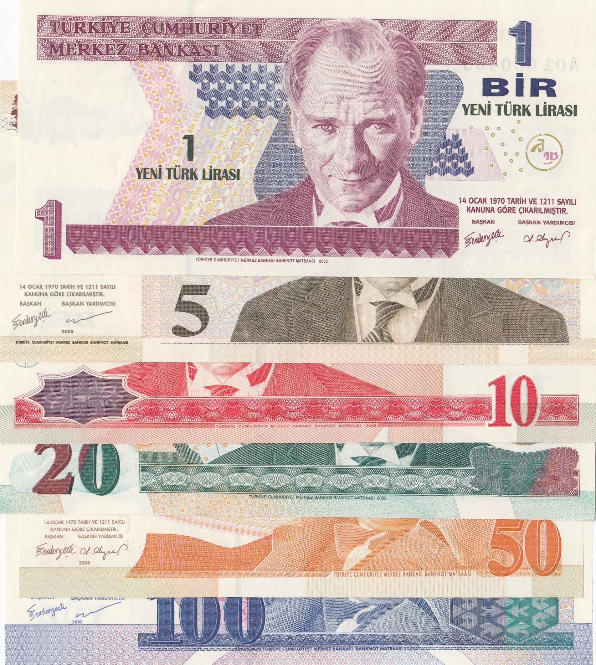 Turkey, 1 New Turkish Lira, 5 New Turkish Lira, 10 New Turkish Lira, 20 New Turkish Lira, 50 New Turkish Lira and 100 New Turkish Lira, 2005, UNC, p216 …p221, (Total 6 banknotes)