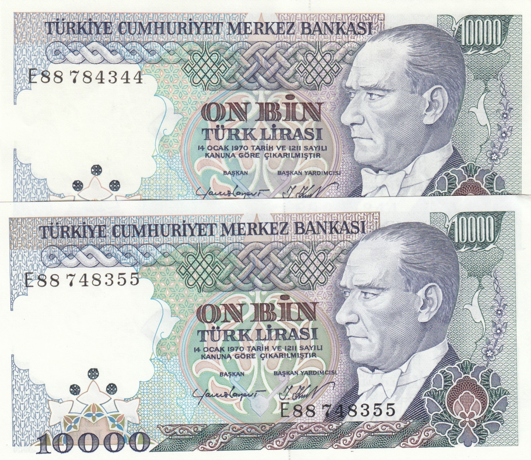Atatürk portrait, serial numbers: E88 748355 and E88 784344, small size and large size watermark set, there are deck crushes