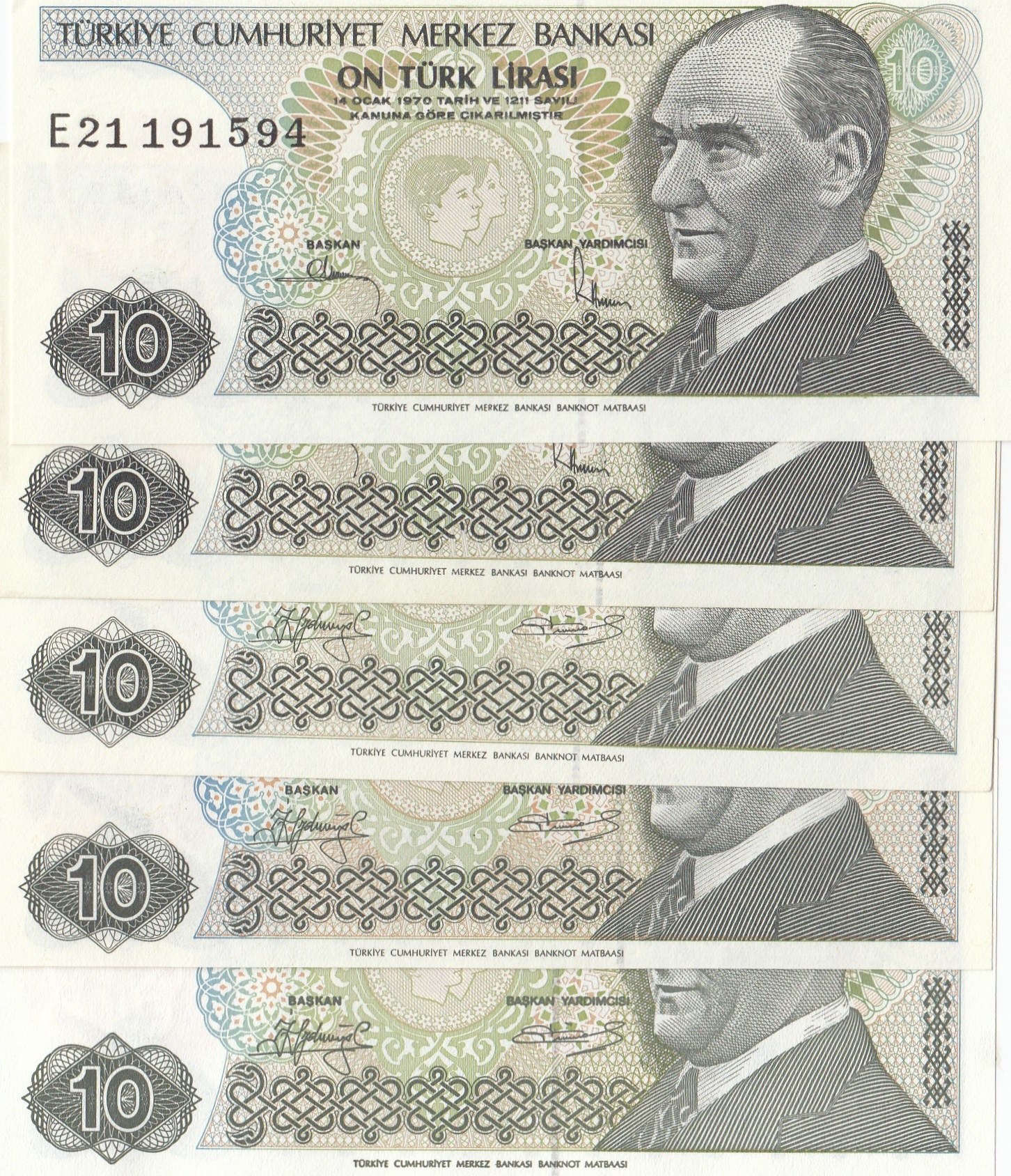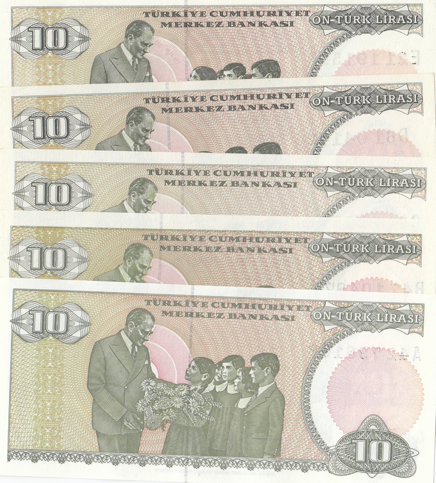 Turkey, 10 Lira, 1979/1982, UNC, 7/1. and 7/2. Emission, p192, p193, (Total 5 banknotes)