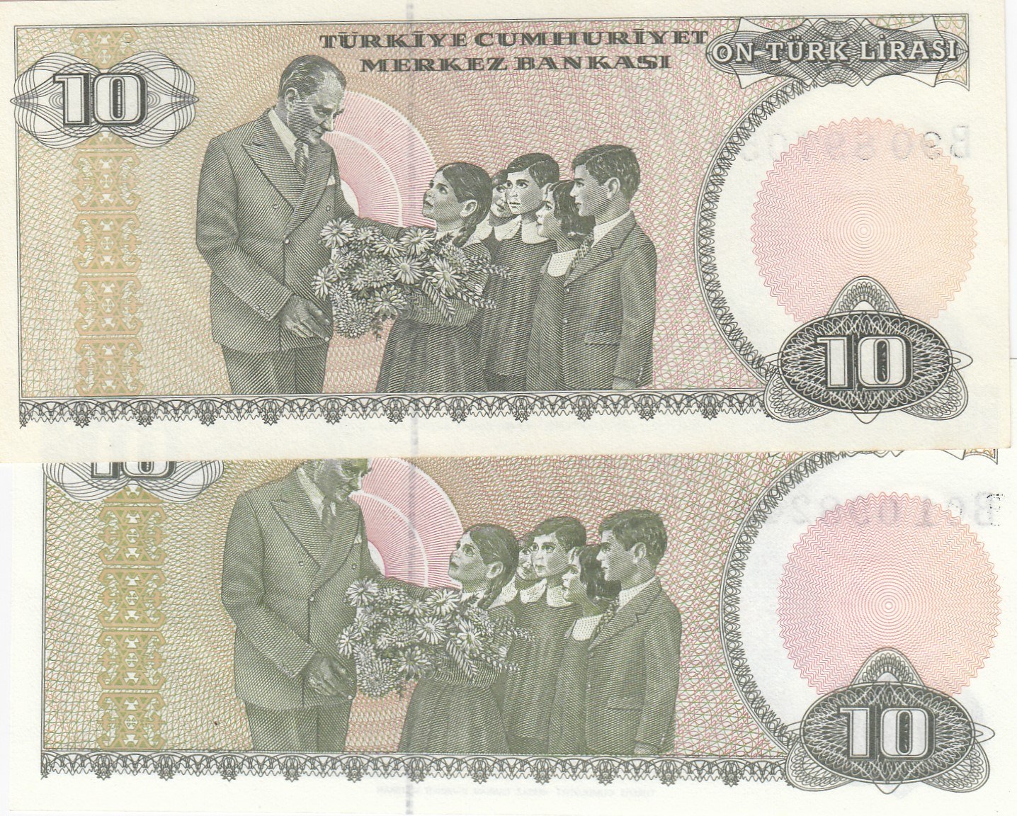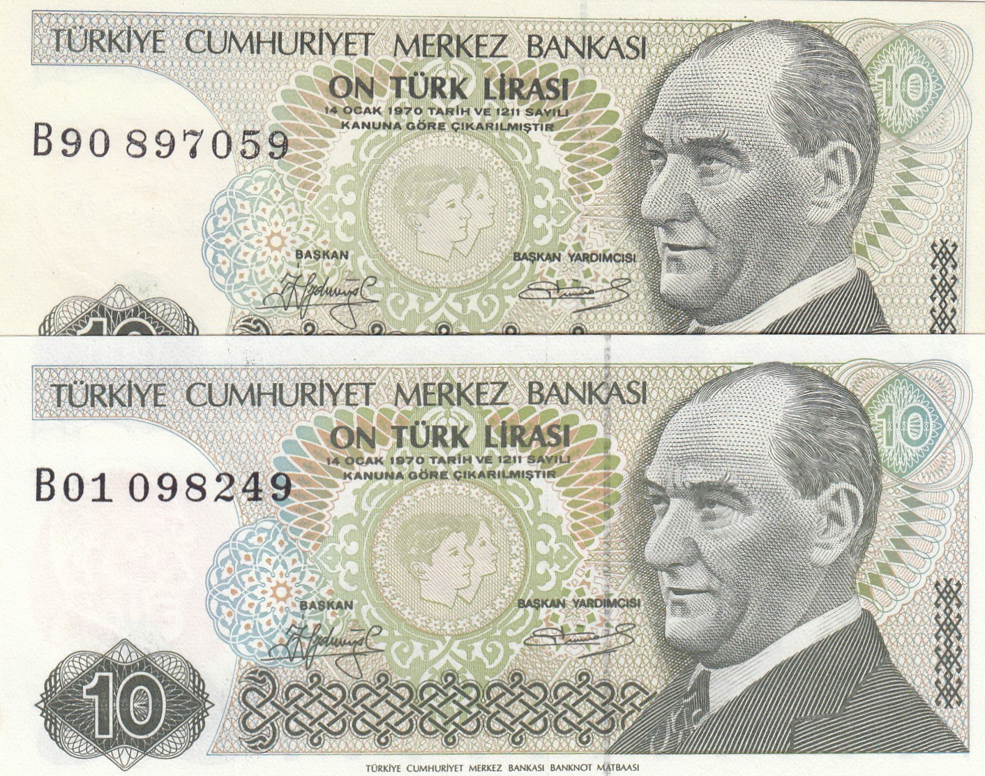 Turkey, 10 Lira, 1979, UNC, 7/1. Emission, p192, "B01" first prefix and "B90" last prefix, (Total 2 banknotes)