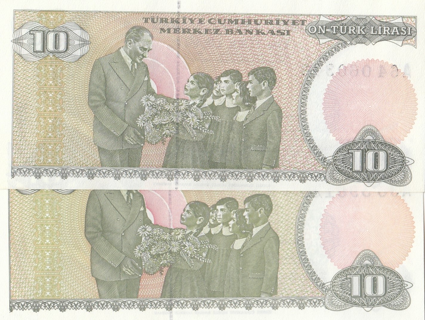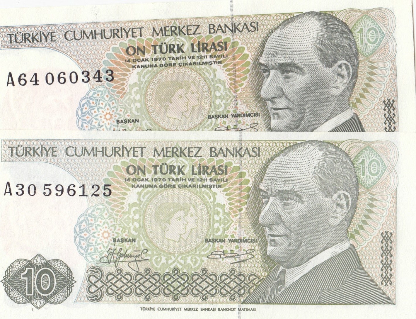 Turkey, 10 Lira, 1979, UNC, 7/1. Emission, p192, LONG EYEBROW AND SHORT EYEBROW SET, (Total 2 banknotes)