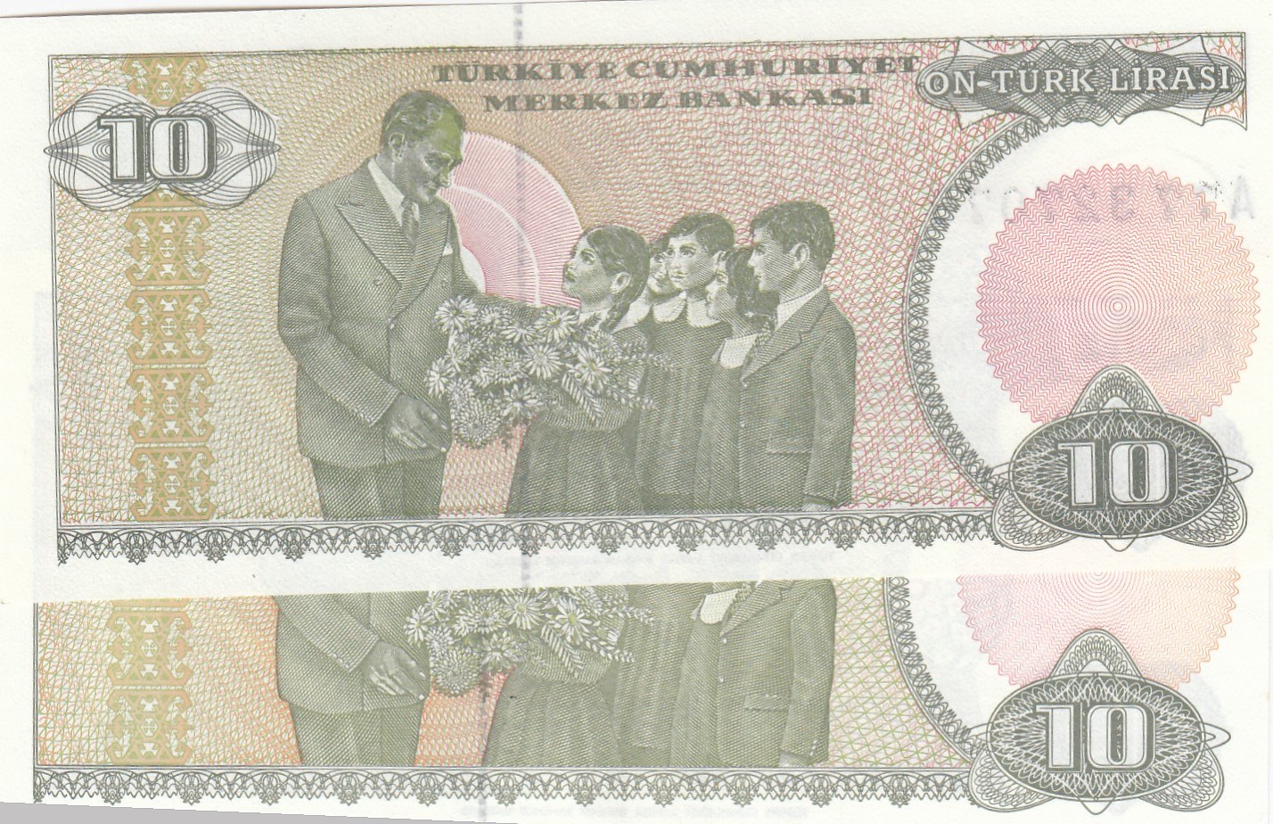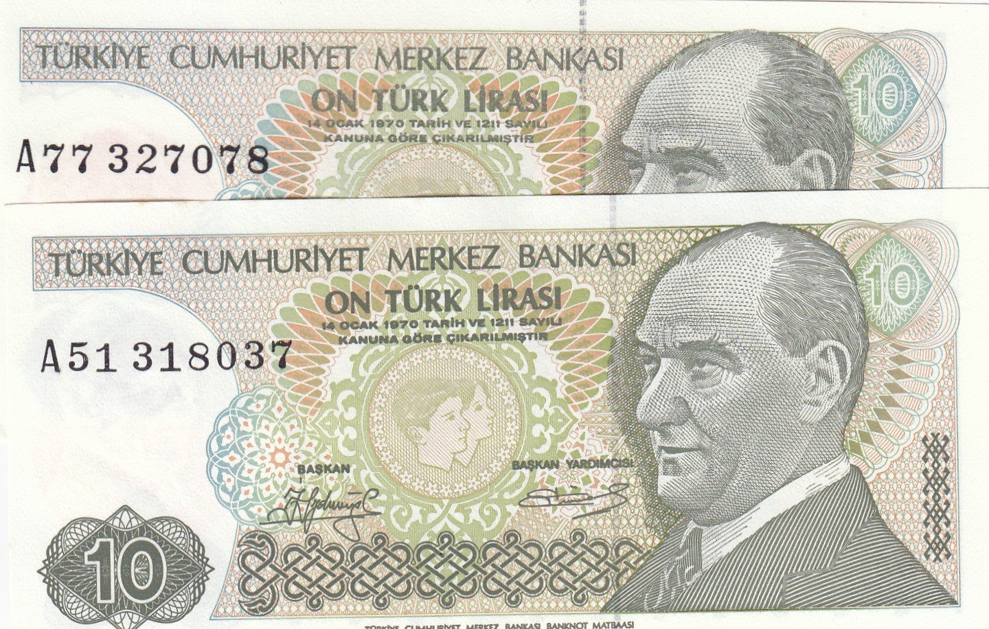 Turkey, 10 Lira, 1979, UNC, 7/1. Emission, p192, LONG EYEBROW AND SHORT EYEBROW SET, (Total 2 banknotes)