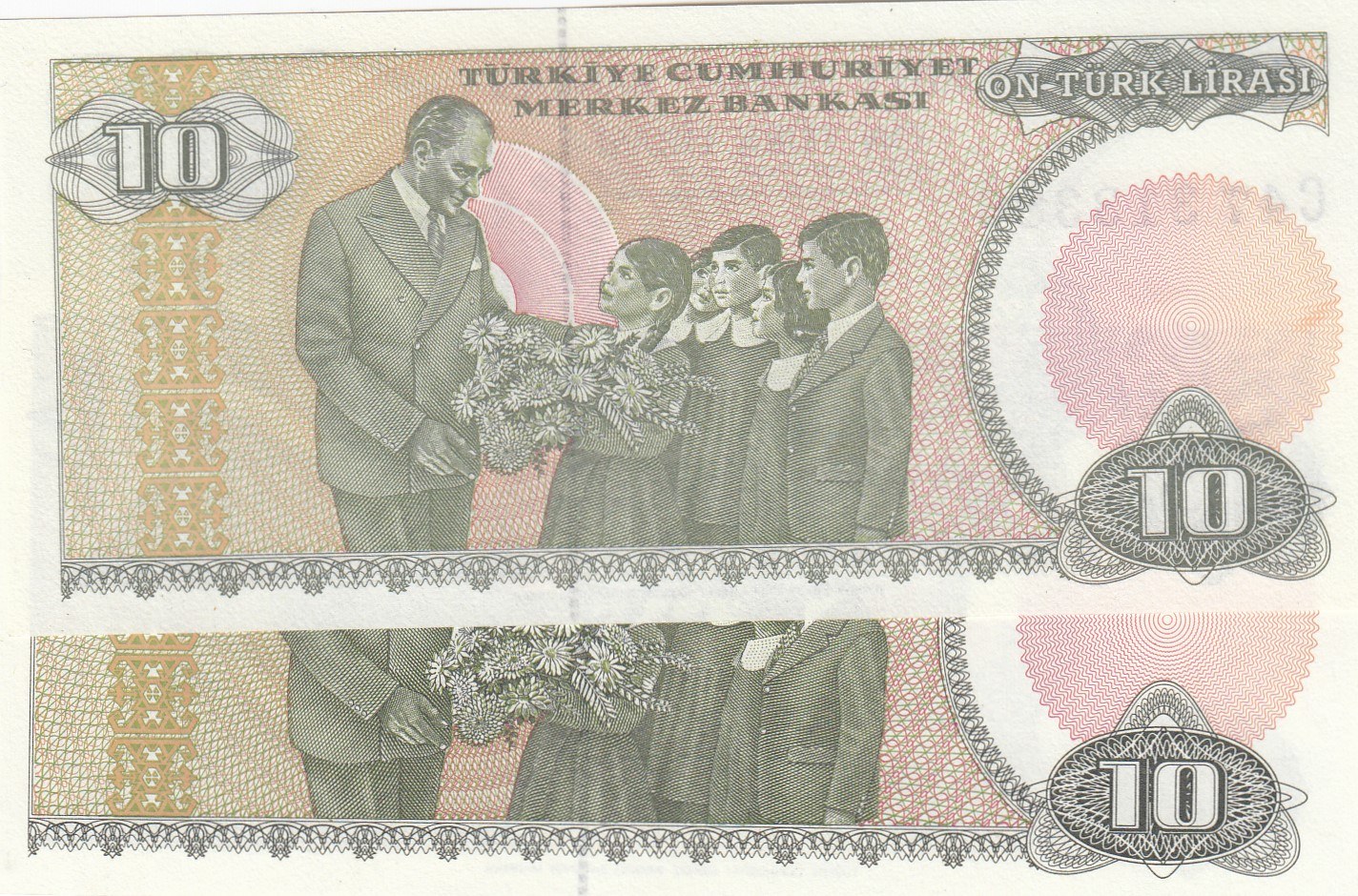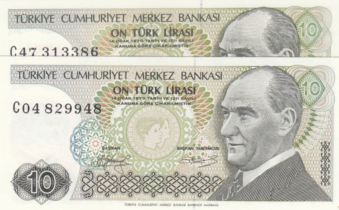 Turkey, 10 Lira, 1979, UNC, 7/1. Emission, p192, LONG EYEBROW AND SHORT EYEBROW SET, (Total 2 banknotes)