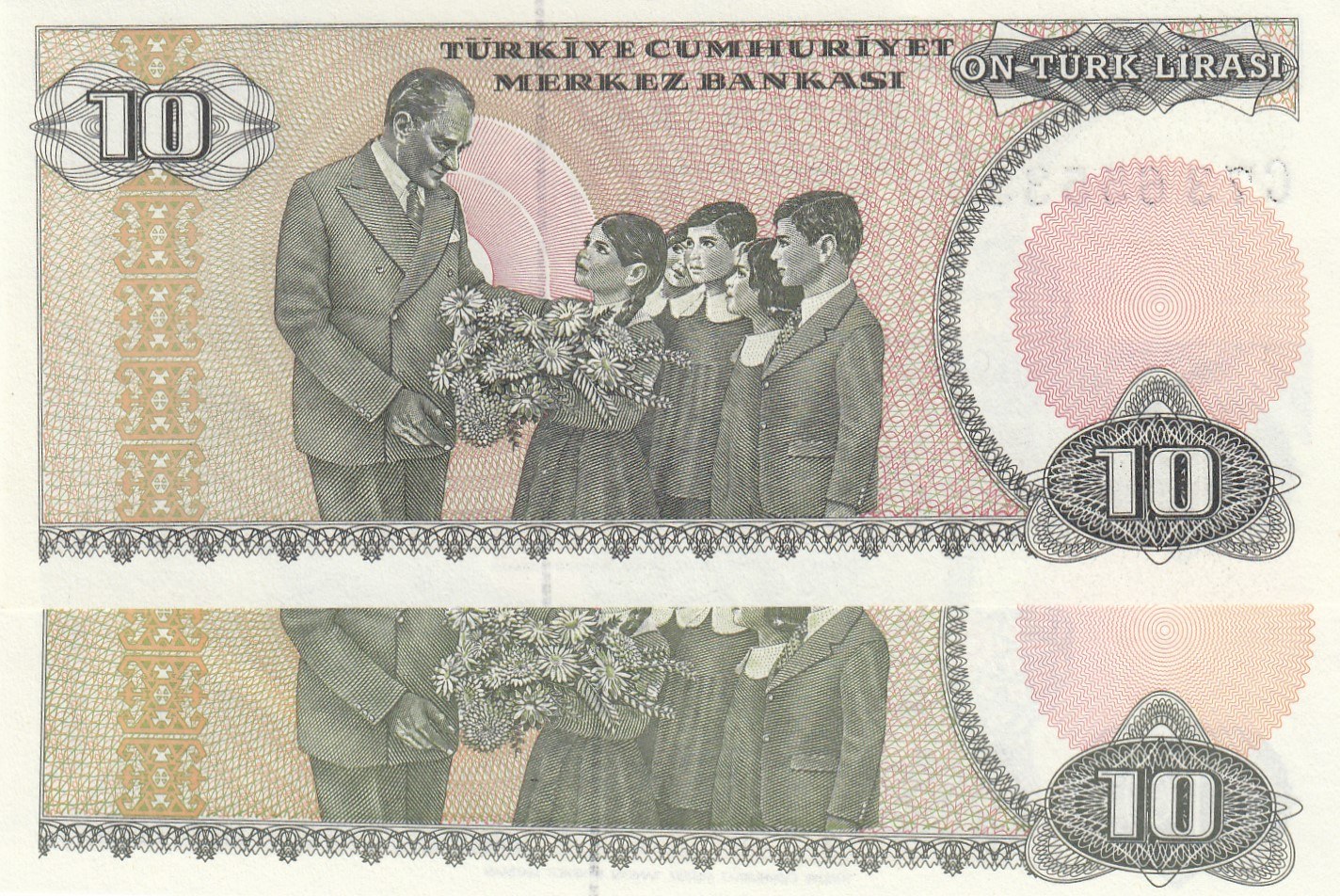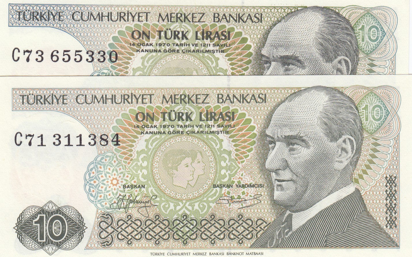 Turkey, 10 Lira, 1979, UNC, 7/1. Emission, p192, LONG EYEBROW AND SHORT EYEBROW SET, (Total 2 banknotes)