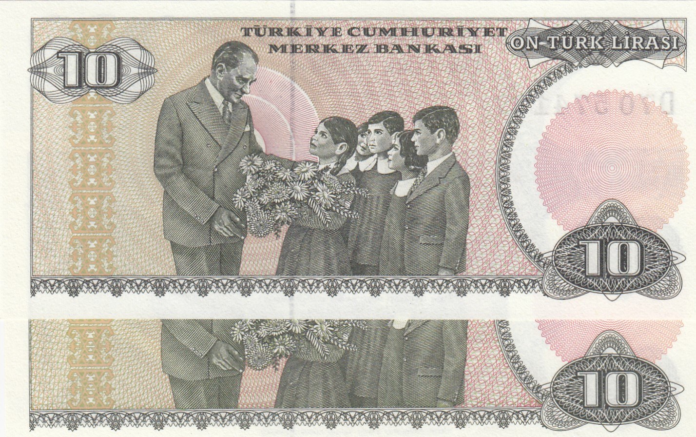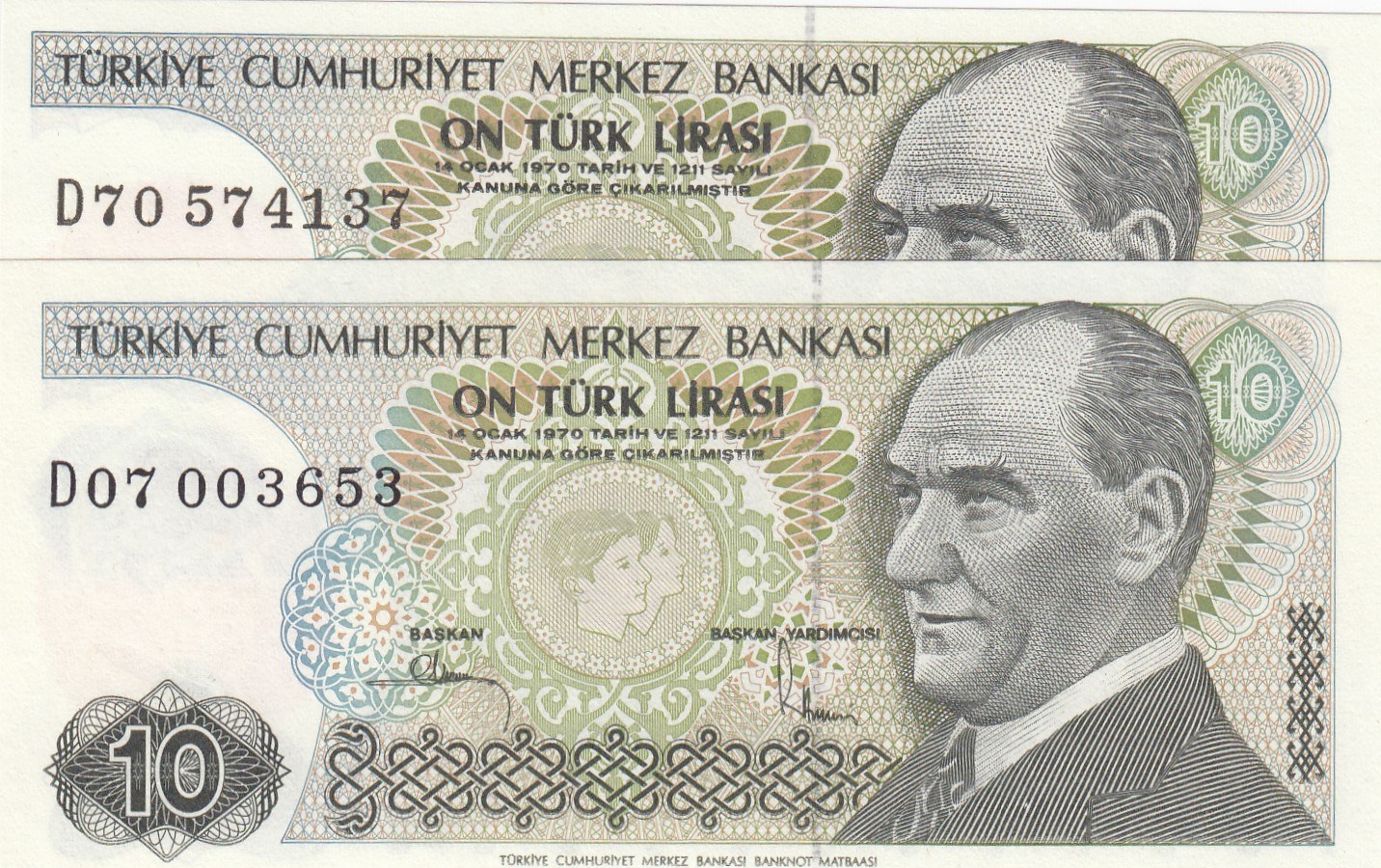 Turkey, 10 Lira, 1982, UNC, 7/2. Emission, p193, PHOSPHORUS NON-PHOSPHORUS SET, (Total 2 banknotes)