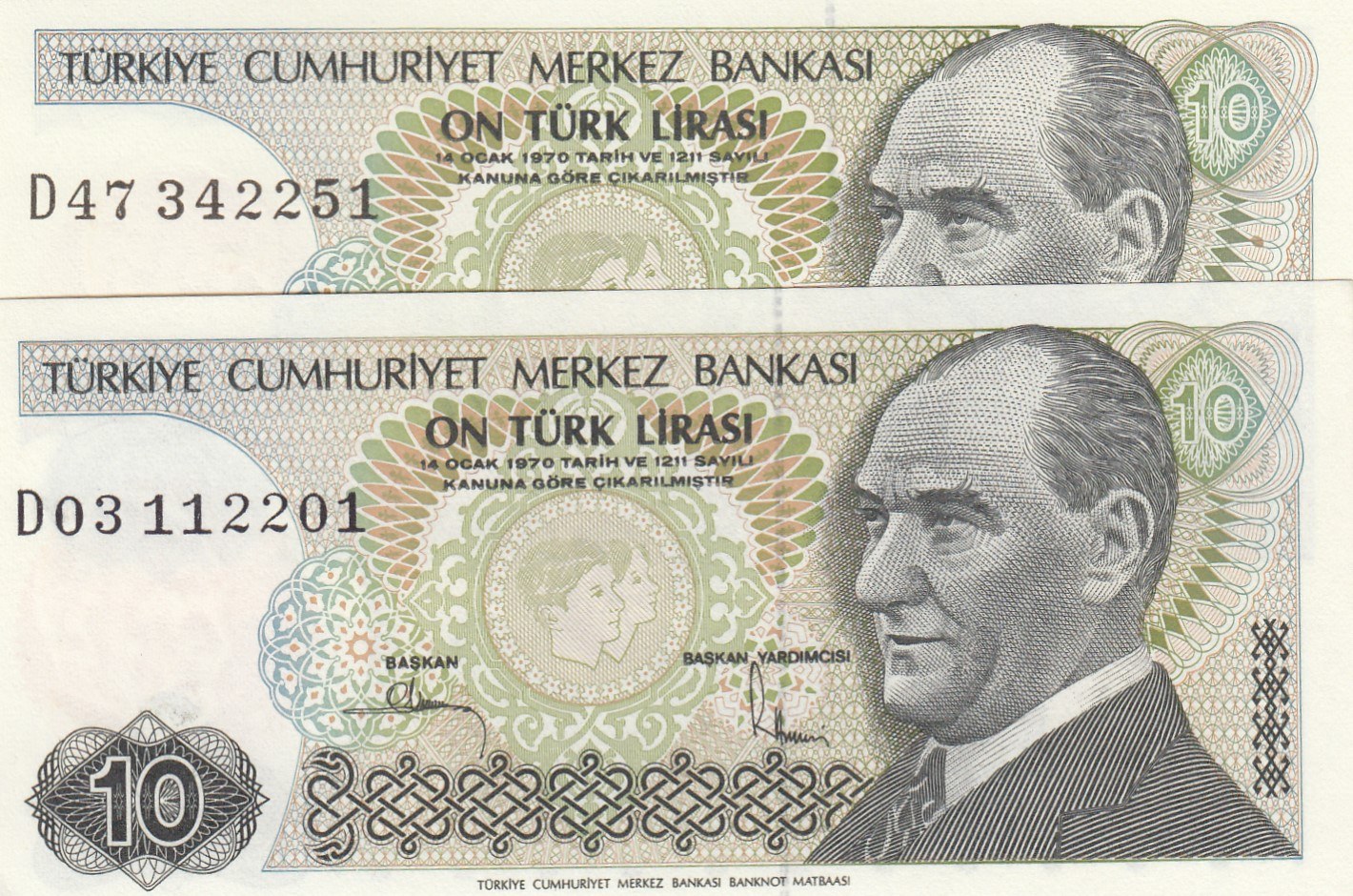 Turkey, 10 Lira, 1982, UNC, 7/2. Emission, p193, PHOSPHORUS NON-PHOSPHORUS SET, (Total 2 banknotes)