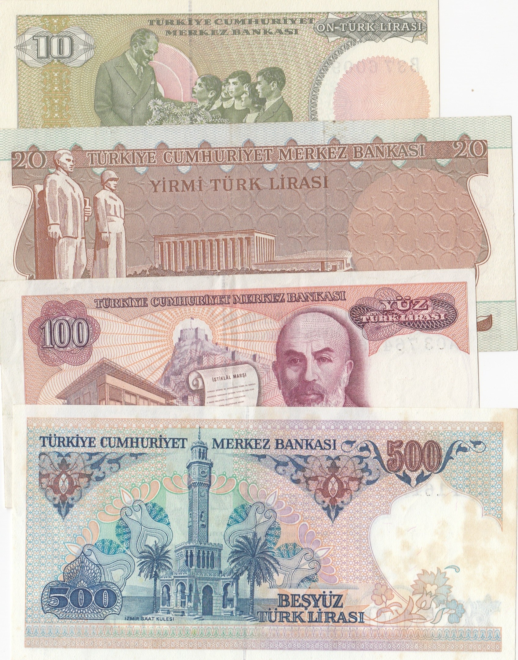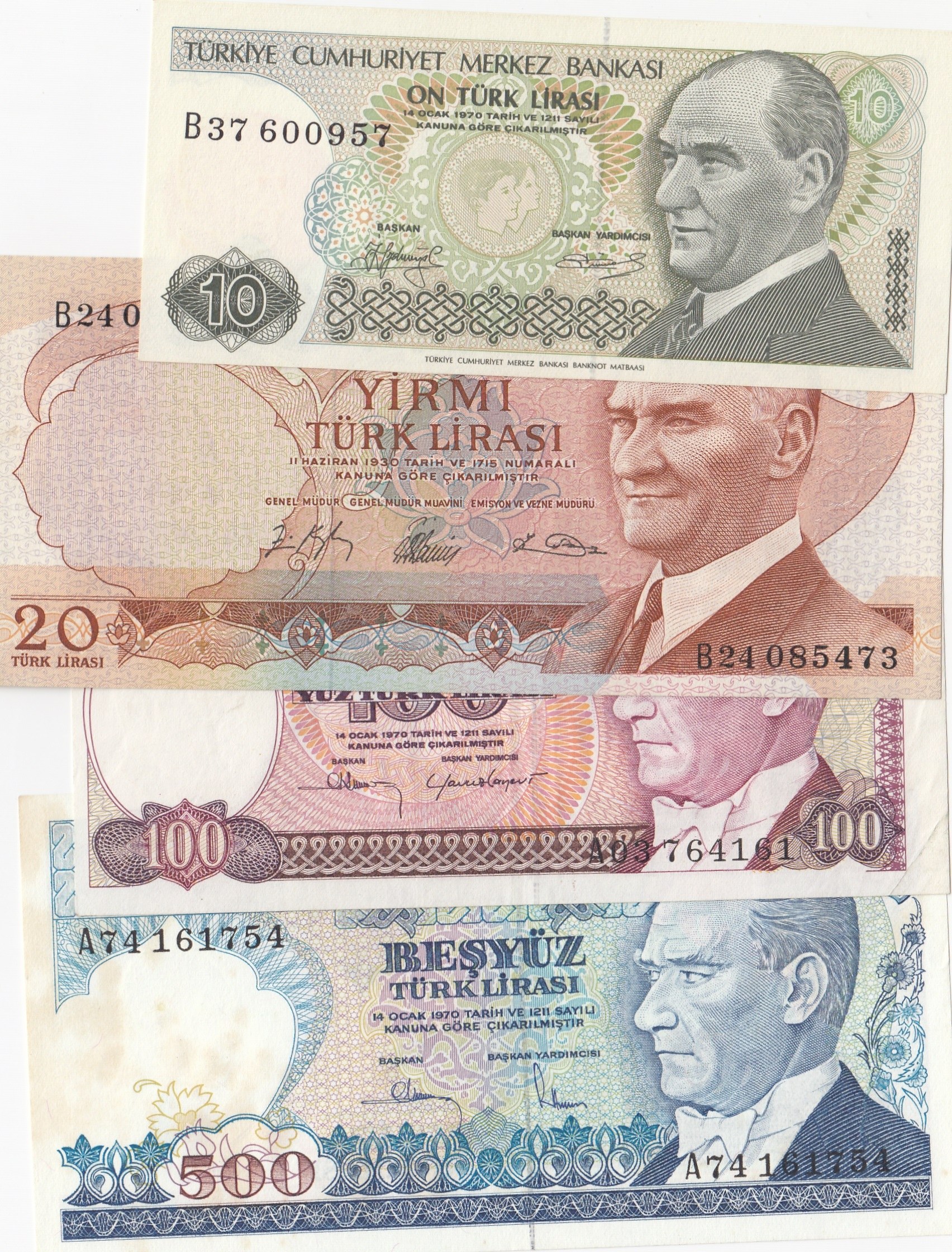 Turkey, 10 Lira, 20 Lira, 100 Lira ve 500 Lira, 1966/1983, AUNC/UNC, (Total 4 banknotes)