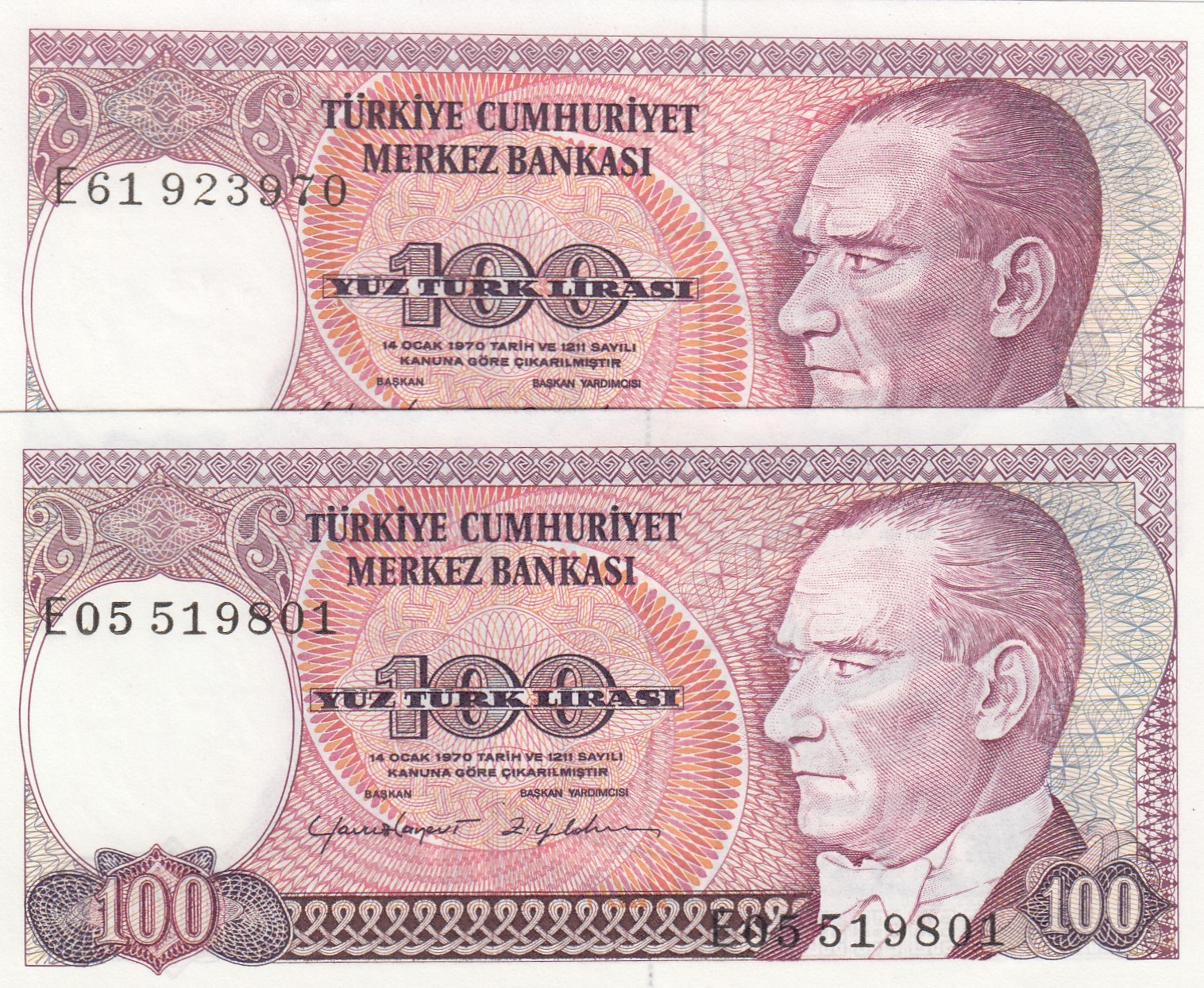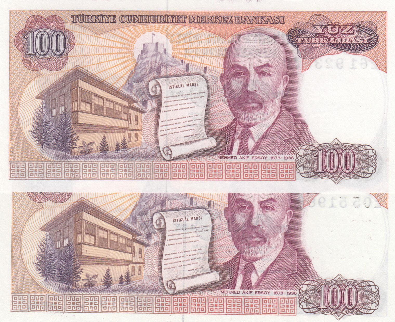 Turkey, 100 Lira, 1984, UNC, 7/2. Emission, p194, DIFFERENT WATERMARK, (Total 2 banknotes)