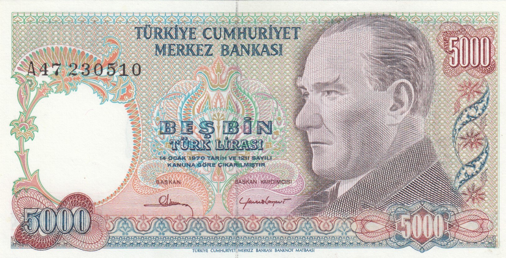 Turkey, 5.000 Lira, 1981, UNC, 7/1. Emission, p196A, NO WATERMARK