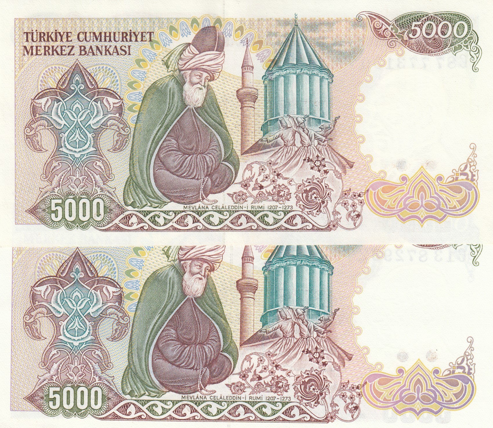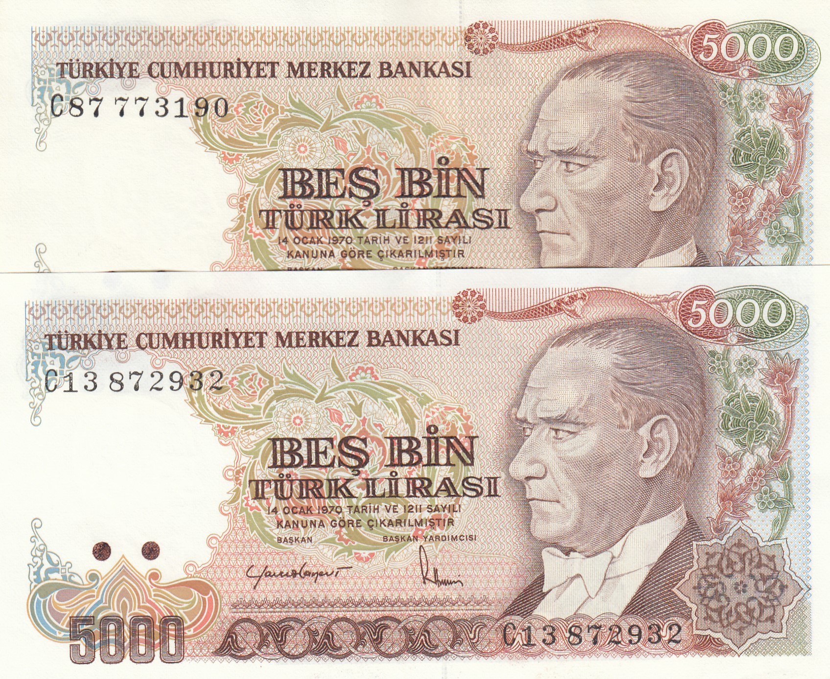 Turkey, 5.000 Lira, 1985, UNC, 7/2. Emission, p197, DIFFERENT WATERMARK, (Total 2 banknotes)