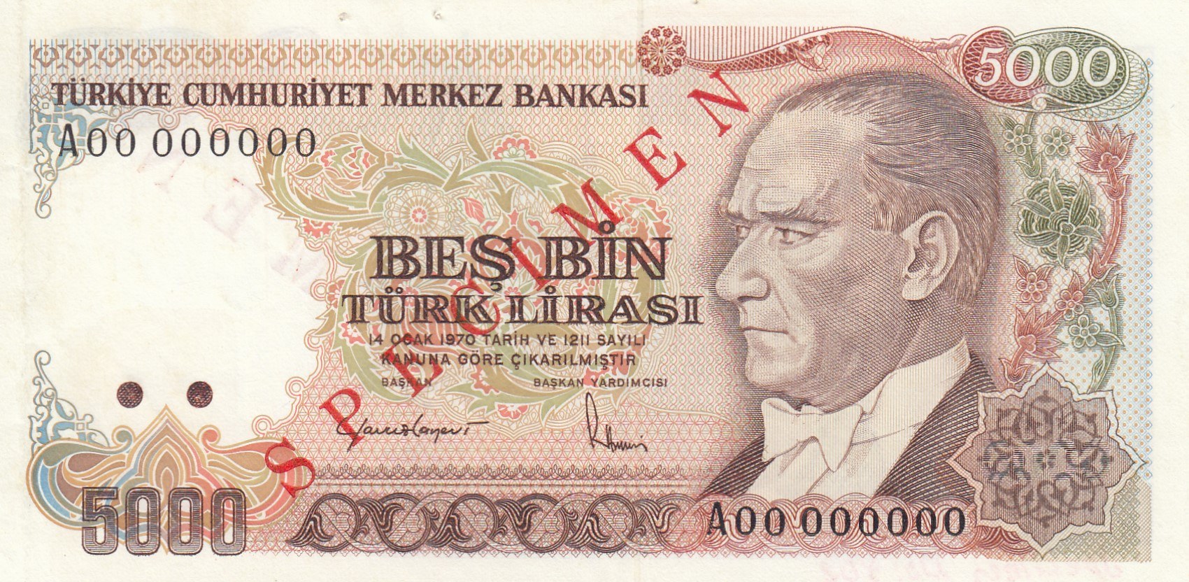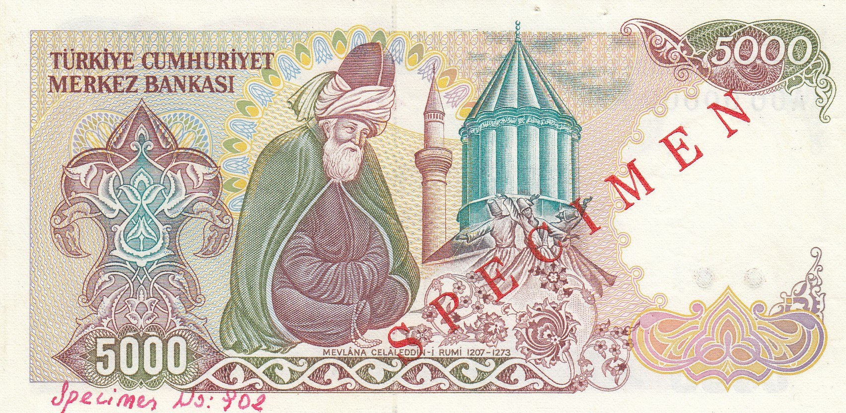 Turkey, 5.000 Lira, 1985, UNC, 7/2. Emission, p197, SPECIMEN