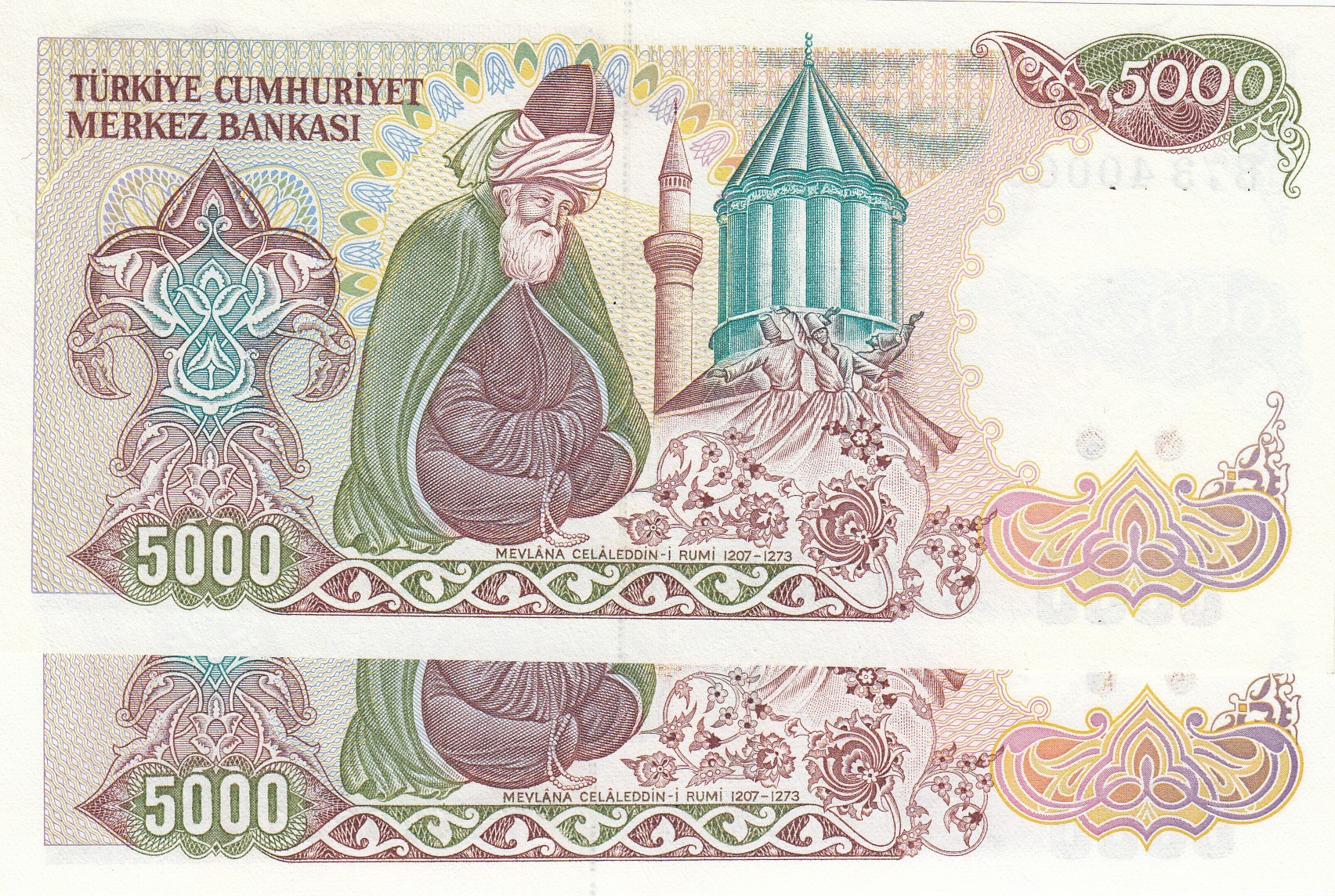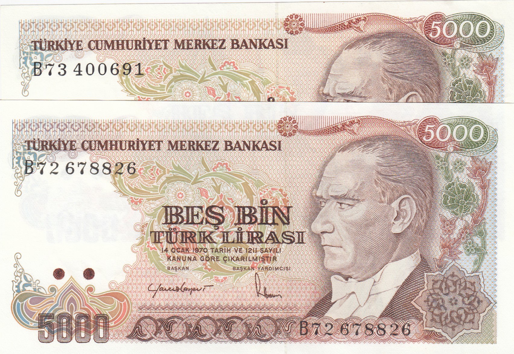 Turkey, 5.000 Lira, 1985, UNC, 7/2. Emission, p197, (Total 2 banknotes)