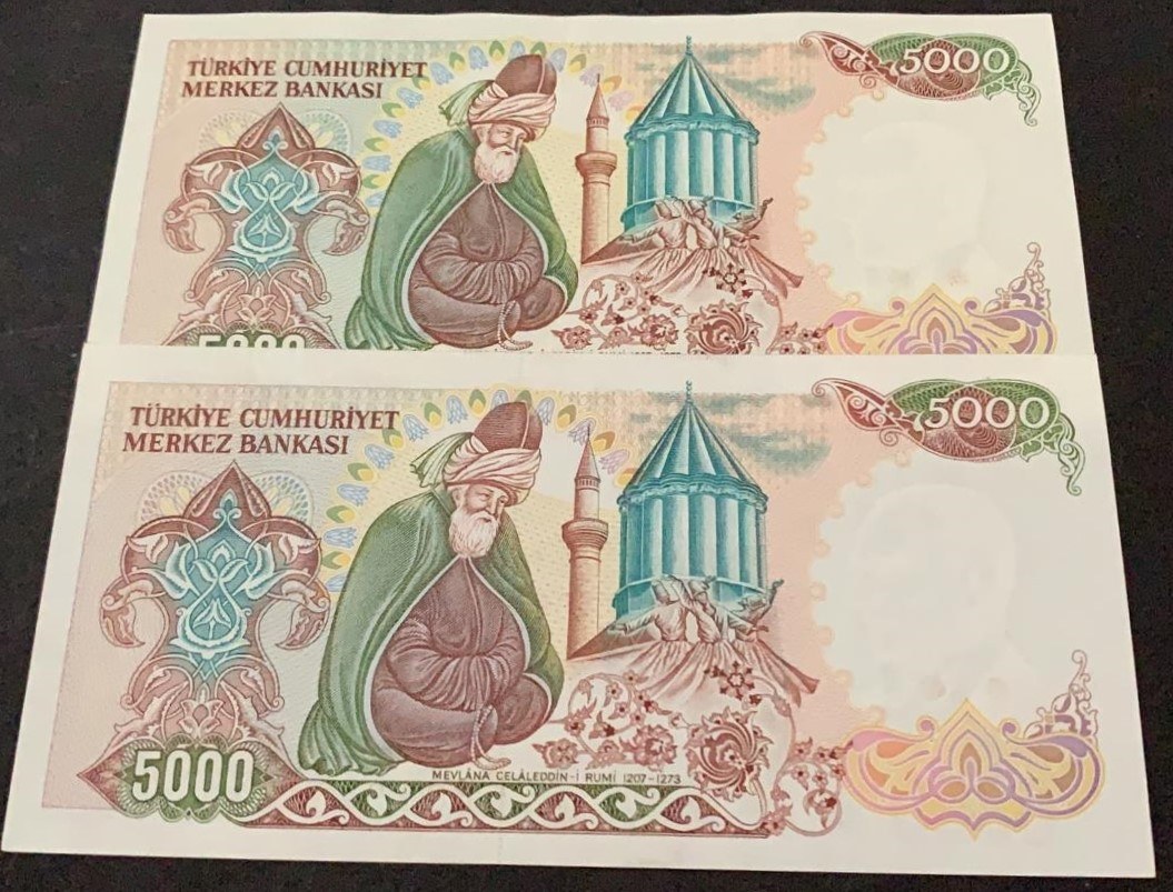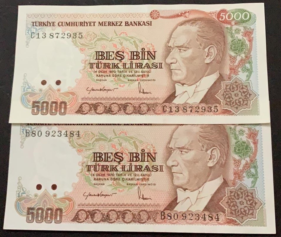 Turkey, 5.000 Lira, 1985, UNC, 7/2. Emission, p197, (Total 2 banknotes)