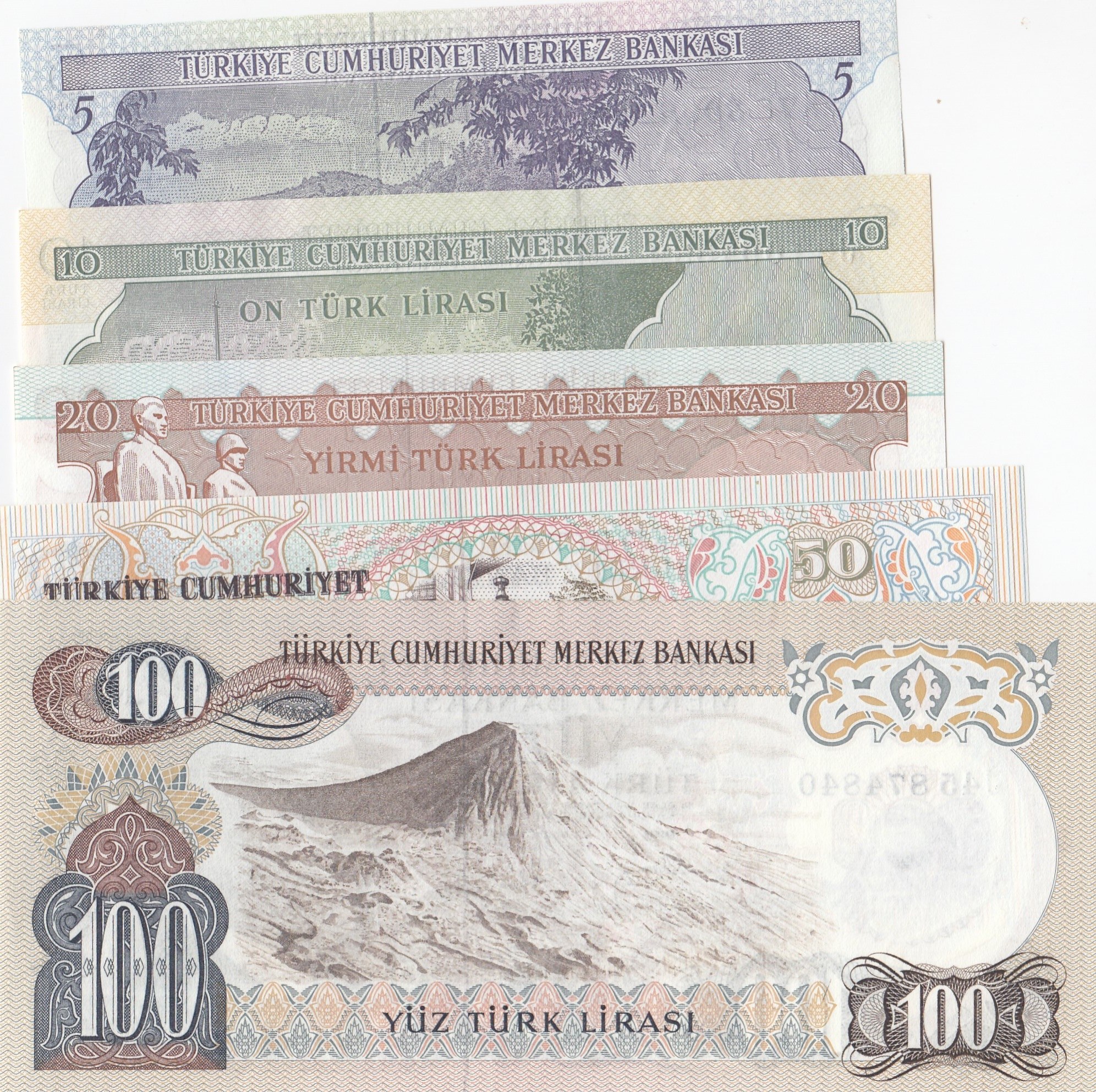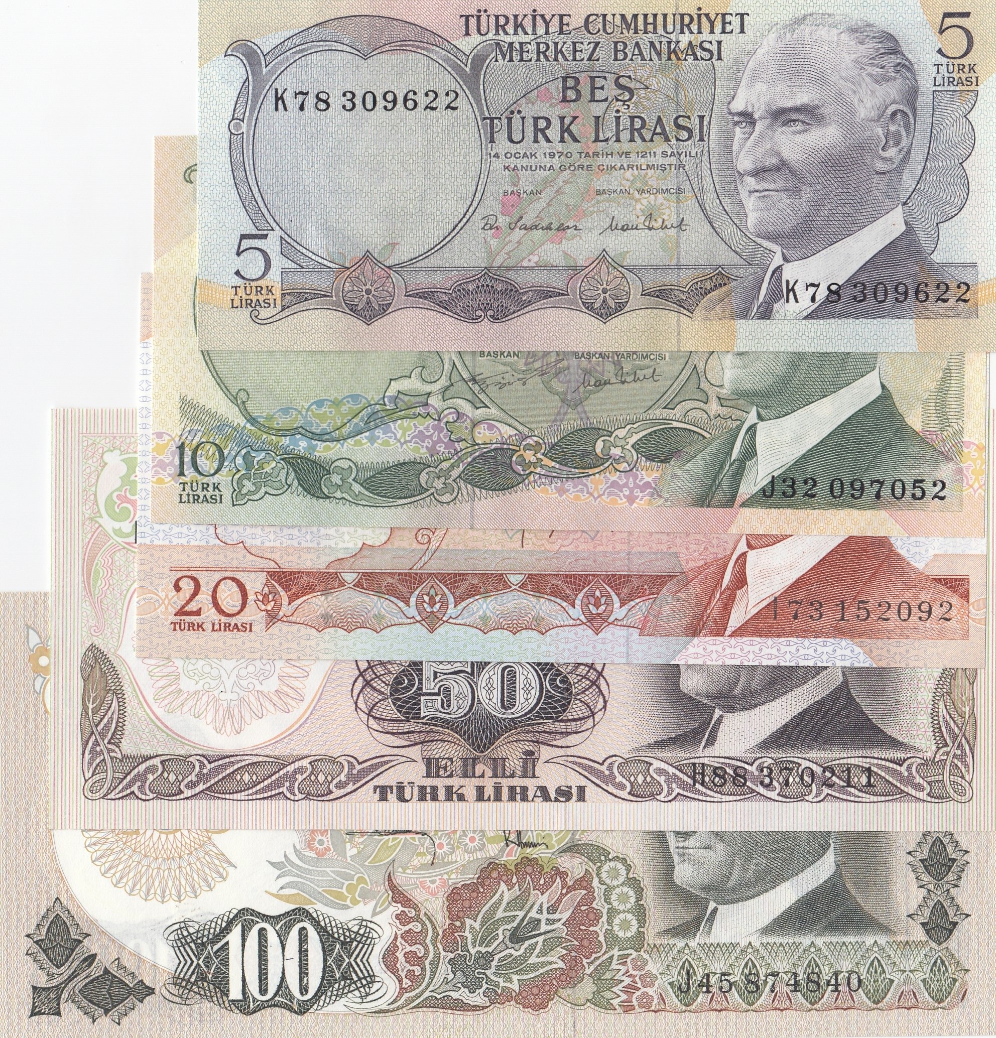 Turkey, 5 Lira, 10 Lira, 20 Lira, 50 Lira and 100 Lira, 1976/1983, UNC, 6. Emission set, (Total 5 banknotes)