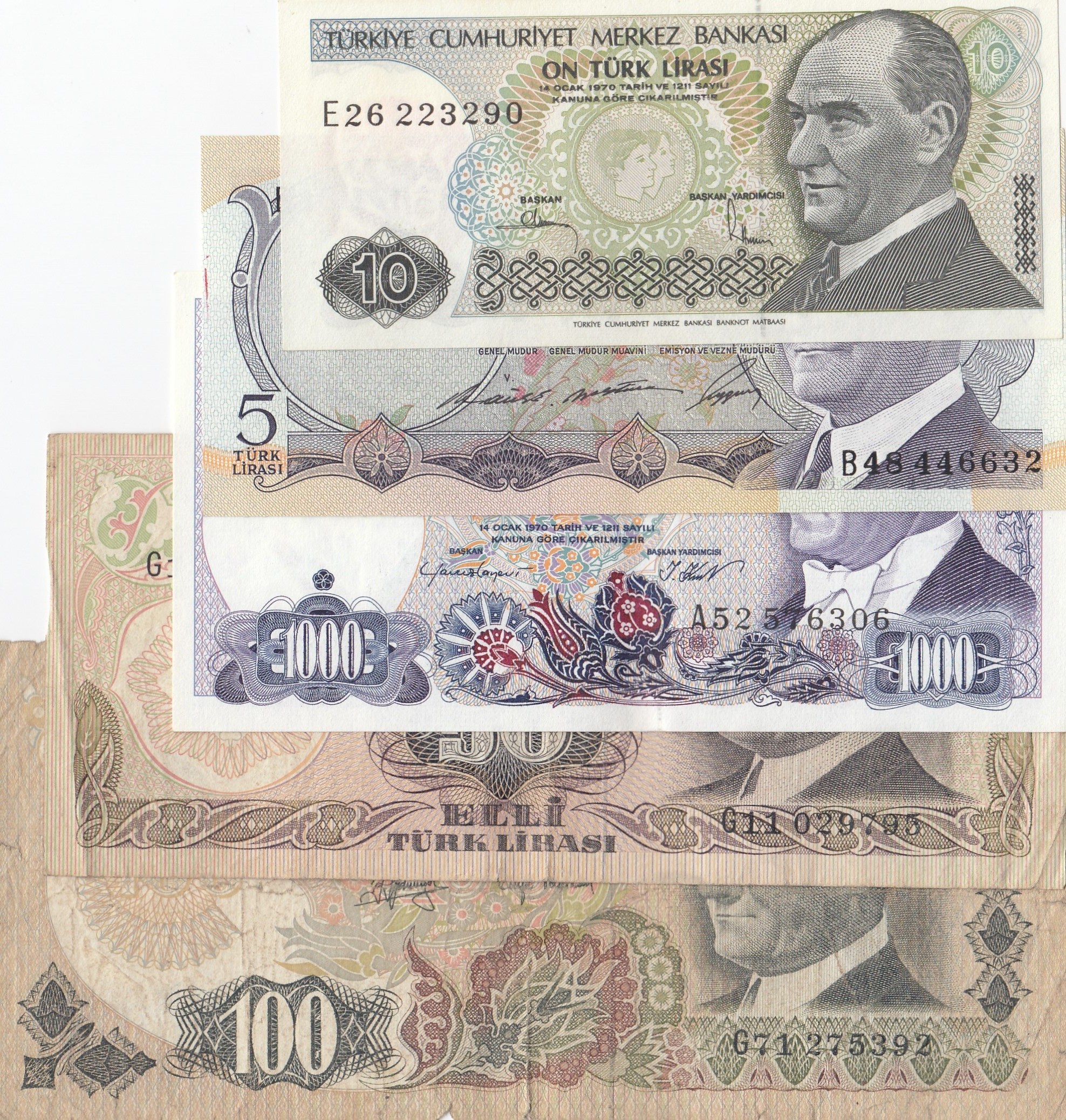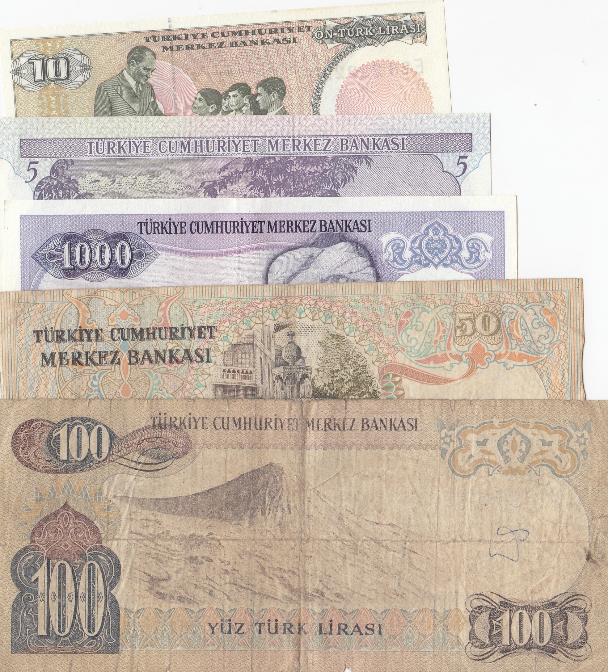 Turkey, 5 Lira, 10 Lira, 50 Lira, 100 Lira and 1.000 Lira, POOR / UNC, (Total 5 banknotes)