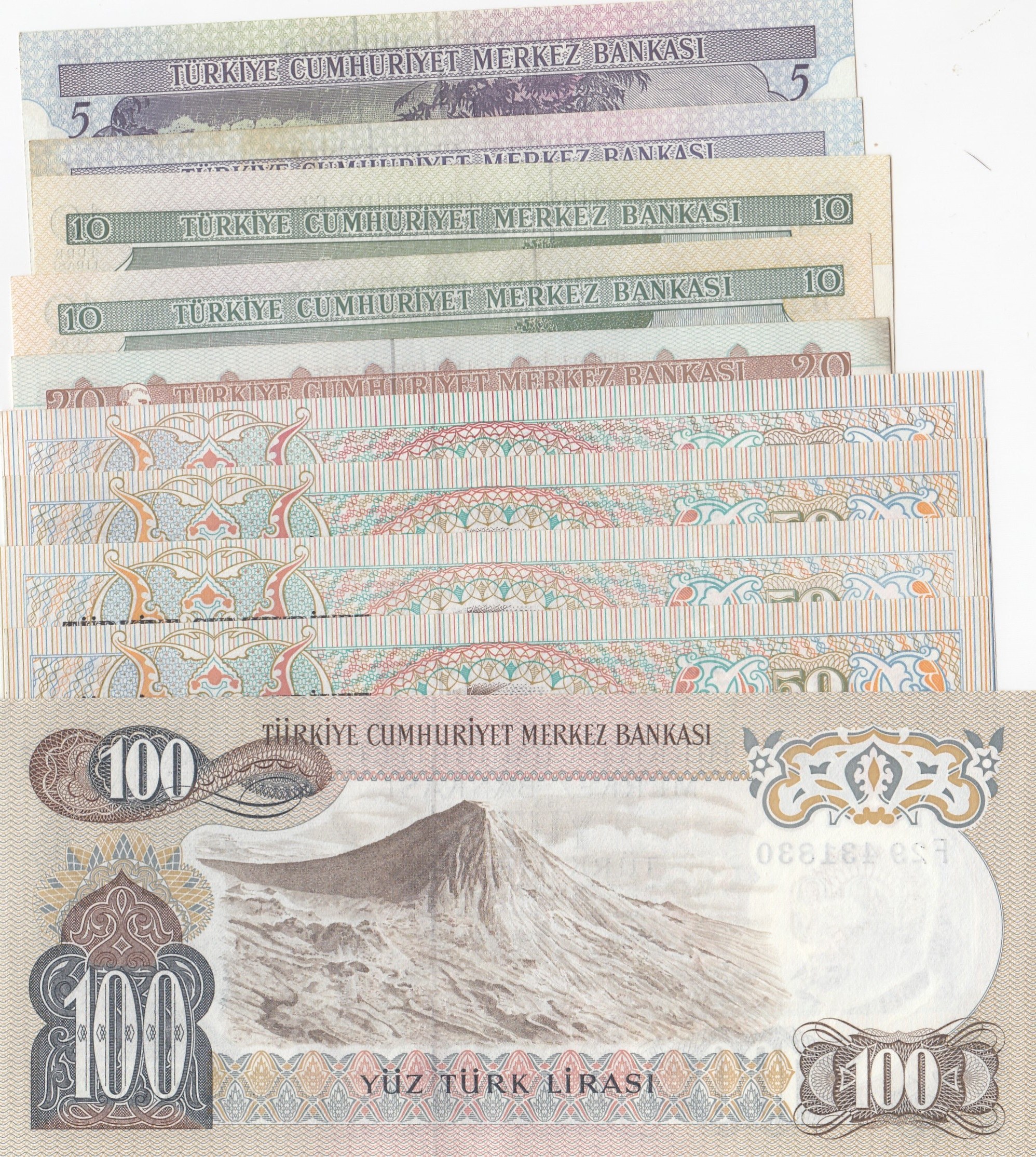 Turkey, 5 Lira (2), 10 Lira (2), 20 Lira, 50 Lira (4) and 100 Lira, AUNC, 6. Emissionn, (Total 10 banknotes)