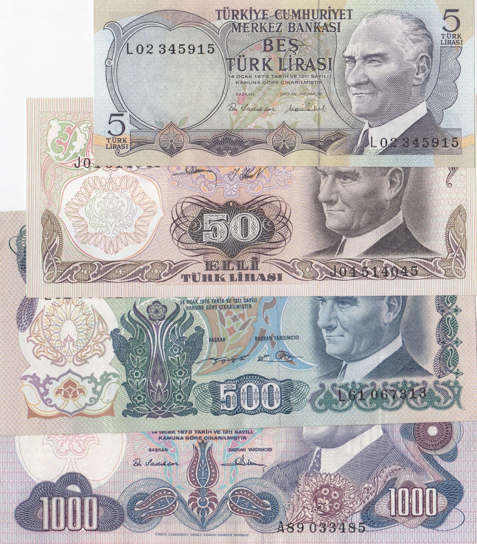 prefix numbers: L02, J04, L61 and A89; 5 and 50 Lira Unc, others XF condition