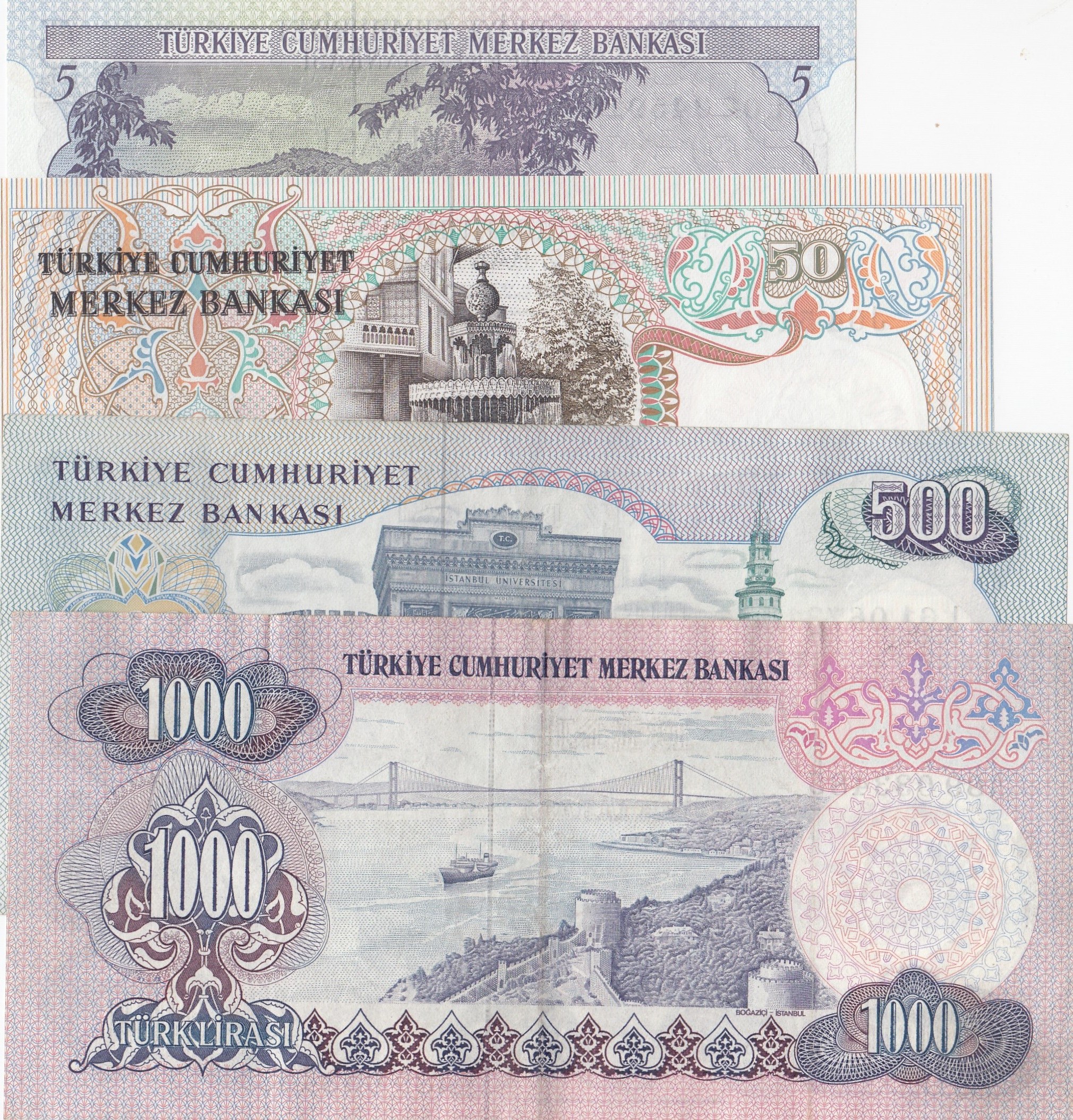 Turkey, 5 Lira, 50 Lira, 500 Lira and 1.000 Lira, 1974/1983, XF/UNC, (Total 4 banknotes)