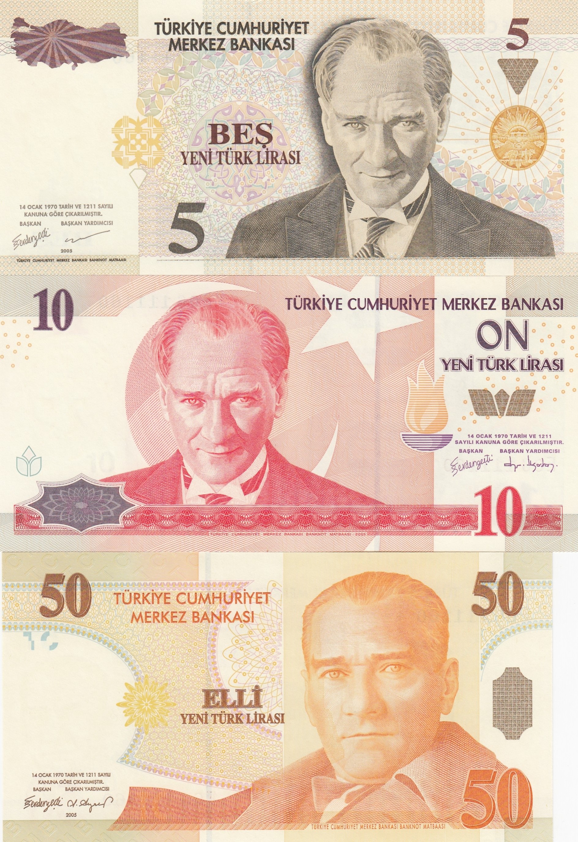 Turkey, 5 New Turkish Lira, 10 Turkish Lira and 50 Turkish Lira, 2005, UNC, 8. Emission, p217, p218, p220, (Total 3 banknotes)