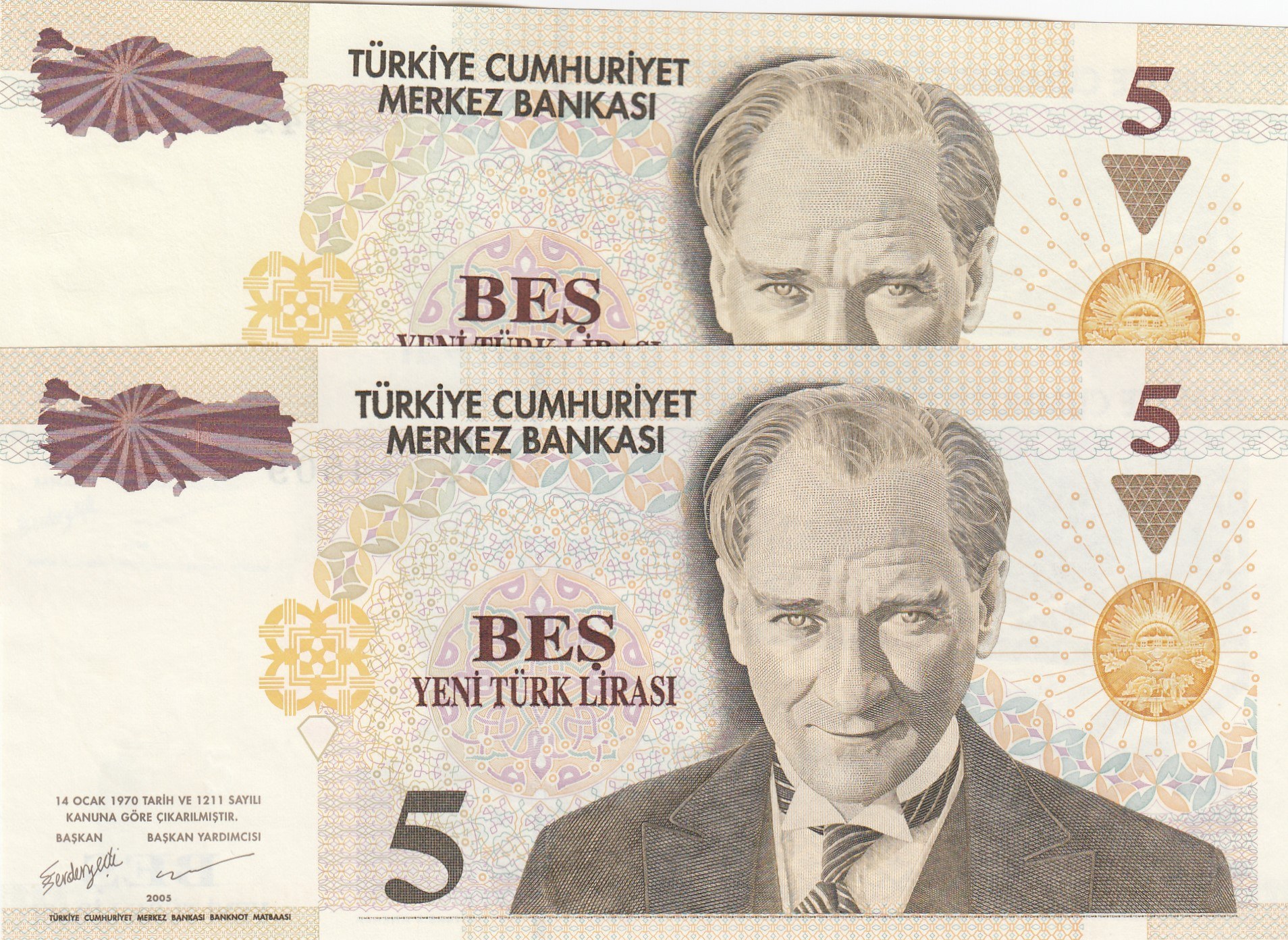 Turkey, 5 New Turkish Lİra, 2005, UNC, 8/1. Emission, p217, DIFFERENT WATERMARK, (Total 2 banknotes)