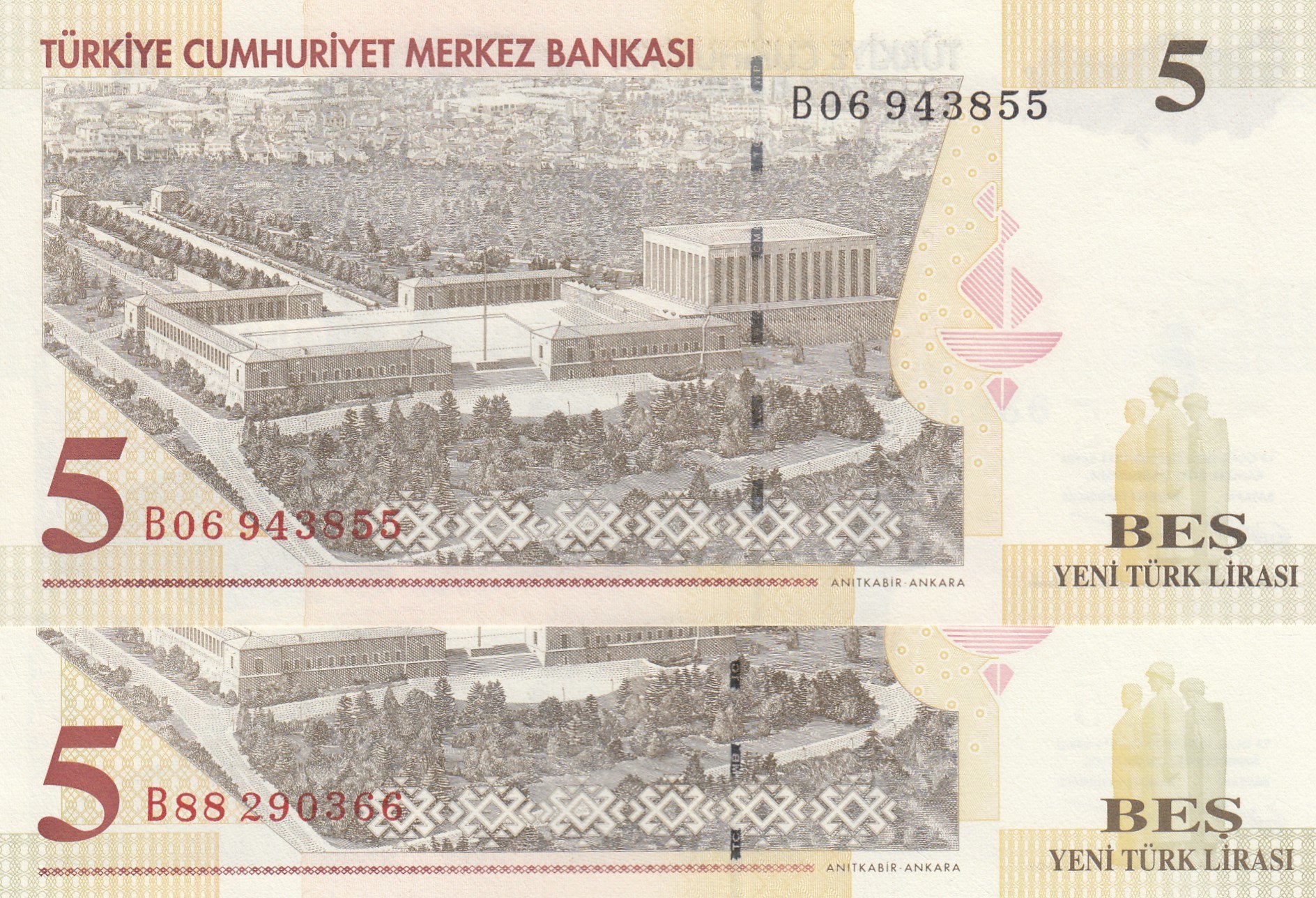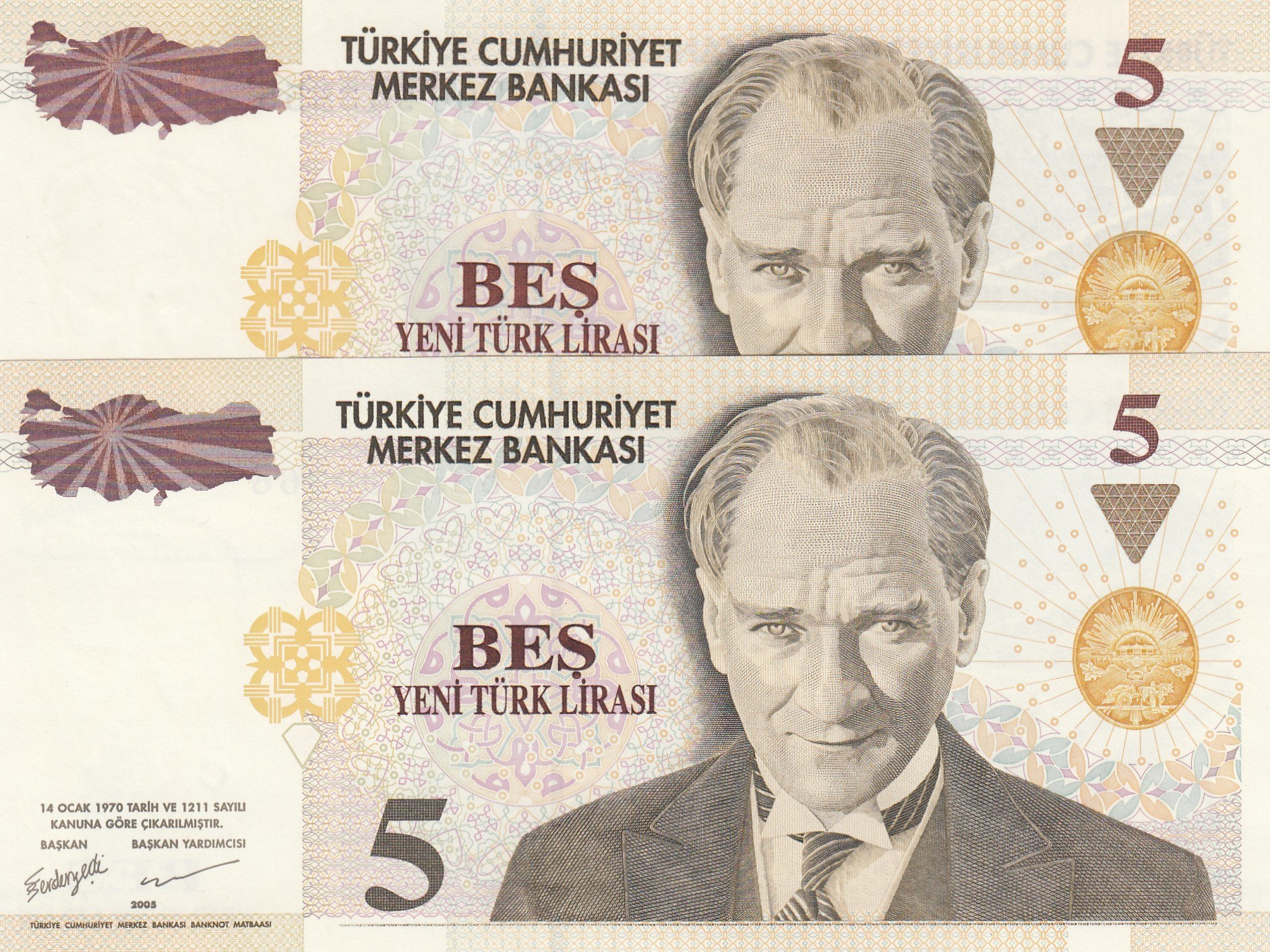 Turkey, 5 New Turkish Lİra, 2005, UNC, 8/1. Emission, p217, DIFFERENT WATERMARK, (Total 2 banknotes)