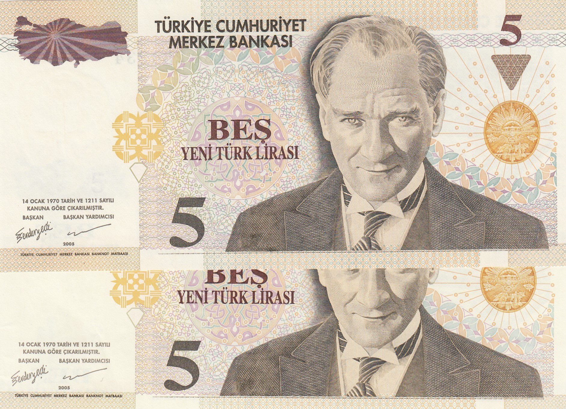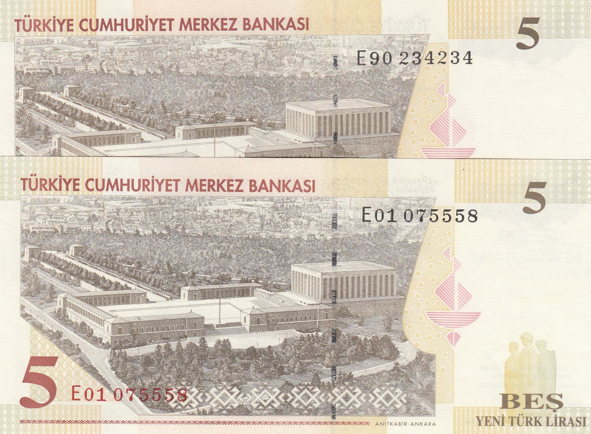 Turkey, 5 New Turkish Lira, 2005, UNC, 8/1. Emission, p217, "E01" first prefix and "E90" last prefix, (Total 2 banknotes)