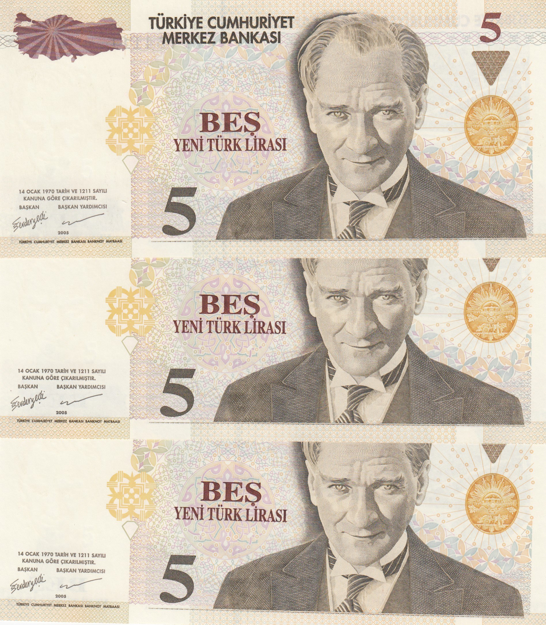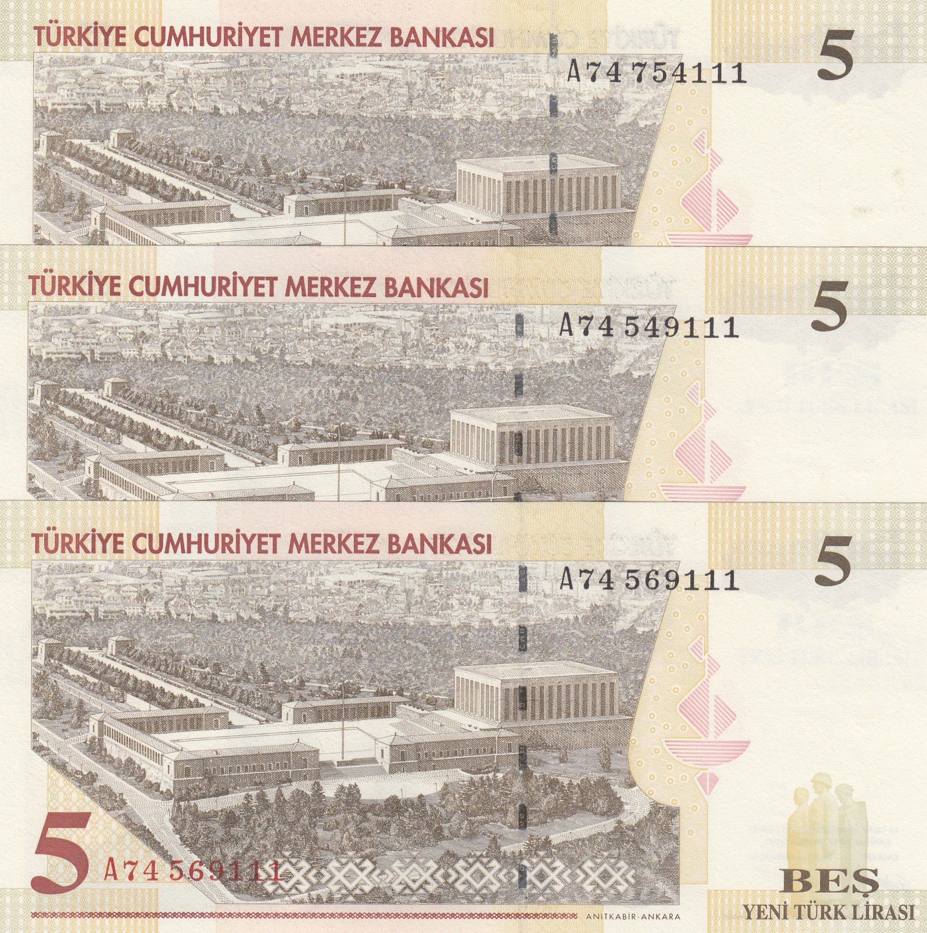 Turkey, 5 New Turkish Lira, 2005, UNC, 8/1. Emission, p217, (Total 3 banknotes)