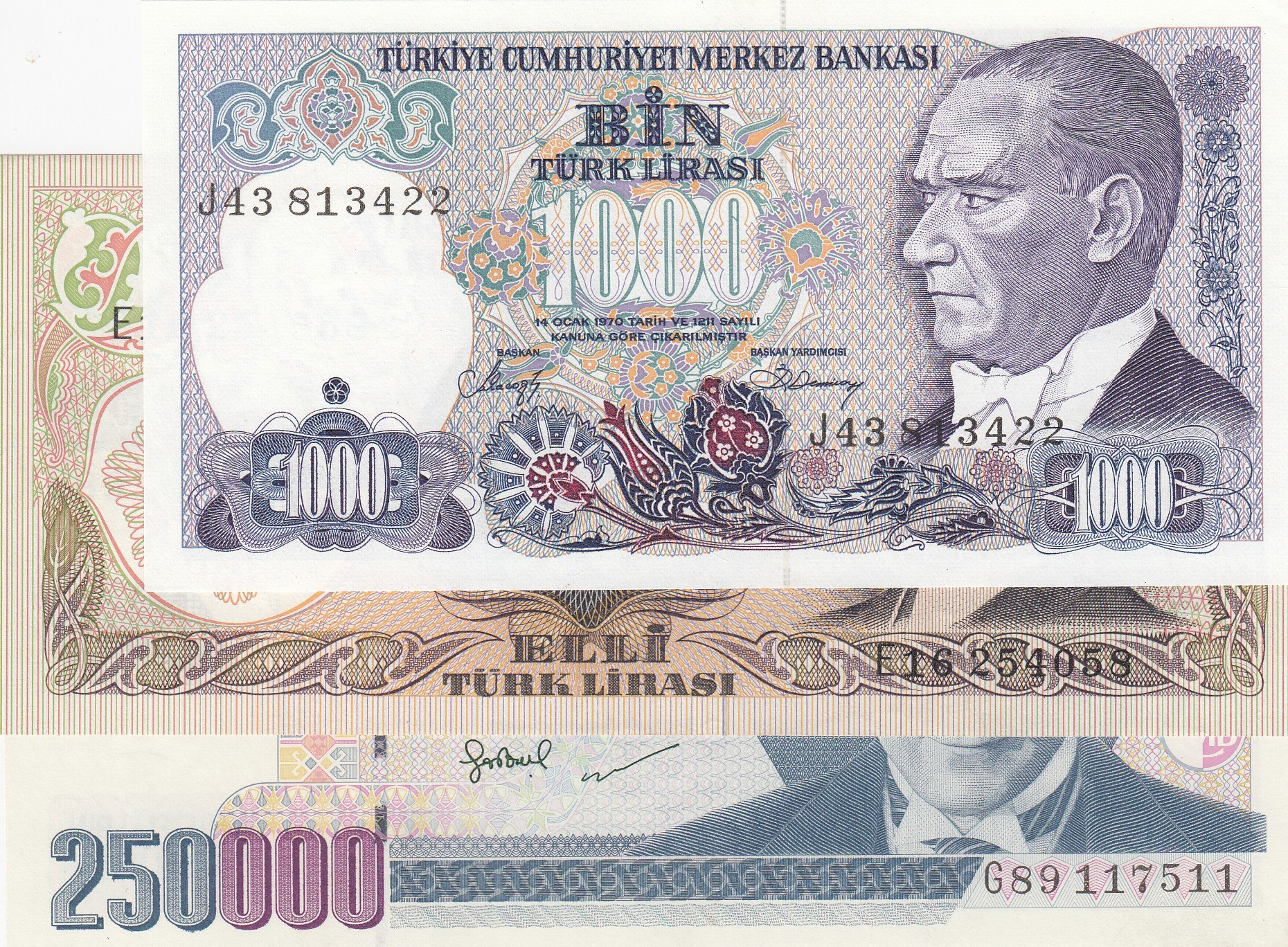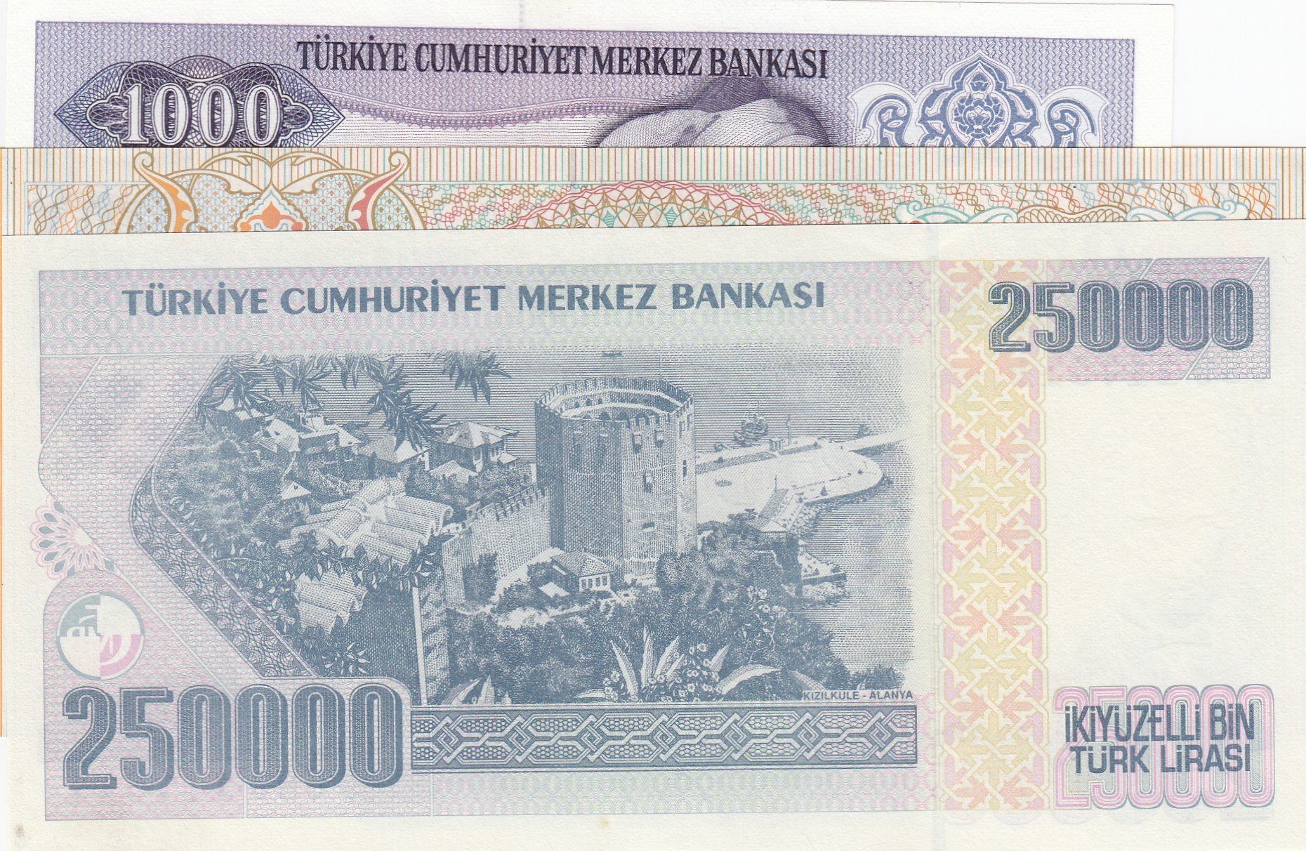 Turkey, 50 Liras, 1000 Liras, 250000 Liras, UNC, (Total 3 banknotes)