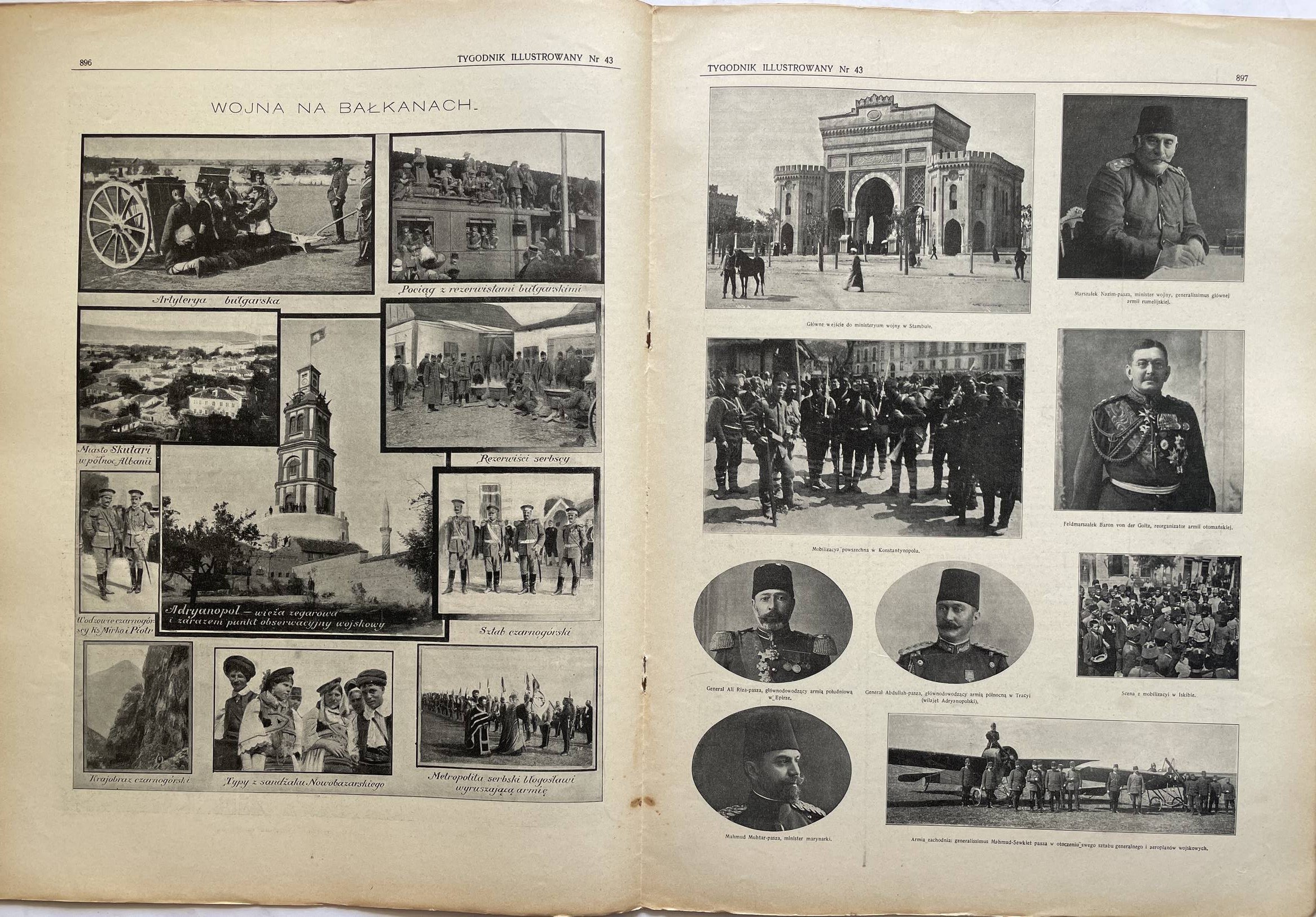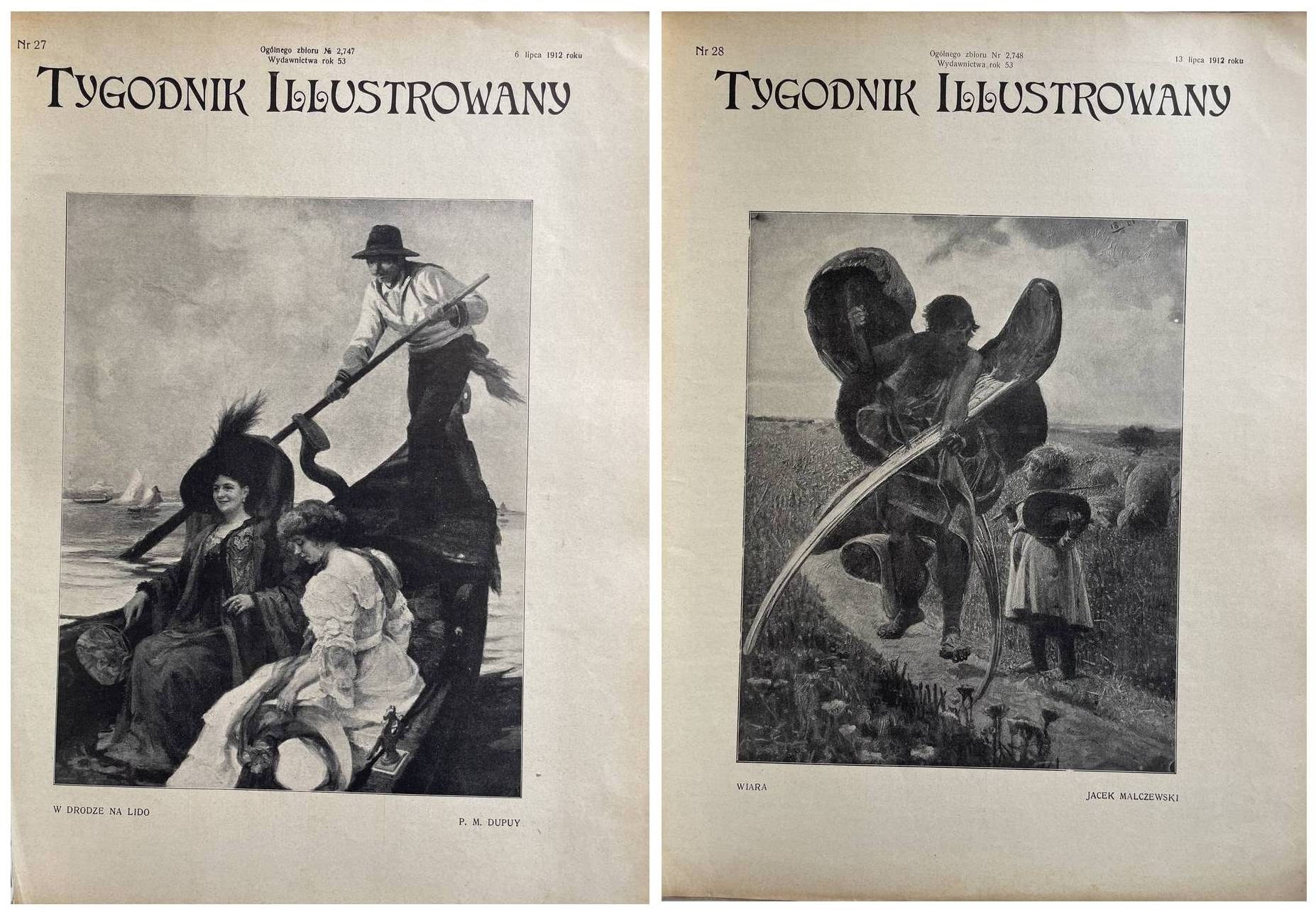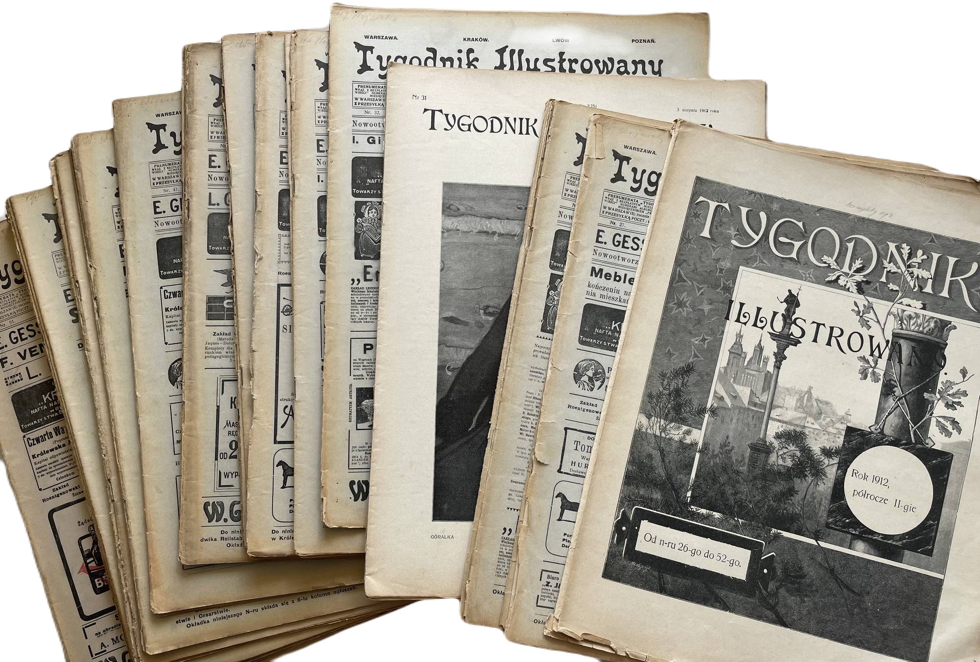 Tygodnik Illustrowany. Rok 1912 nr nr 27-53 (jest mylnie 52), II półrocze. 39 cm, str. 8, [1], 560-1082. Kompletny egz. Egz. luzem w okł. wyd. (brak 3), stan dobry plus.
