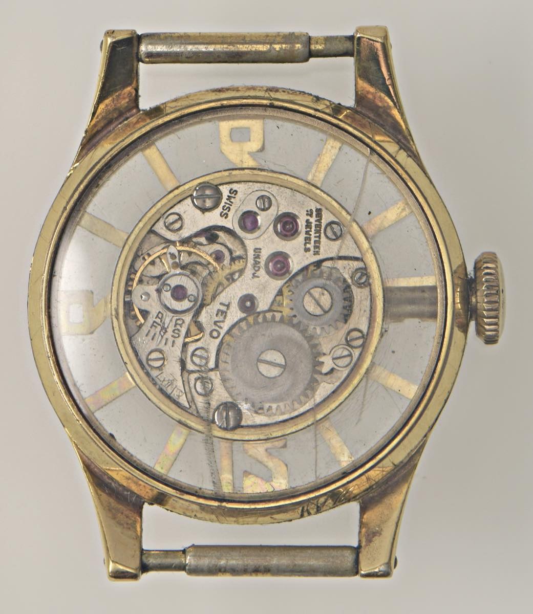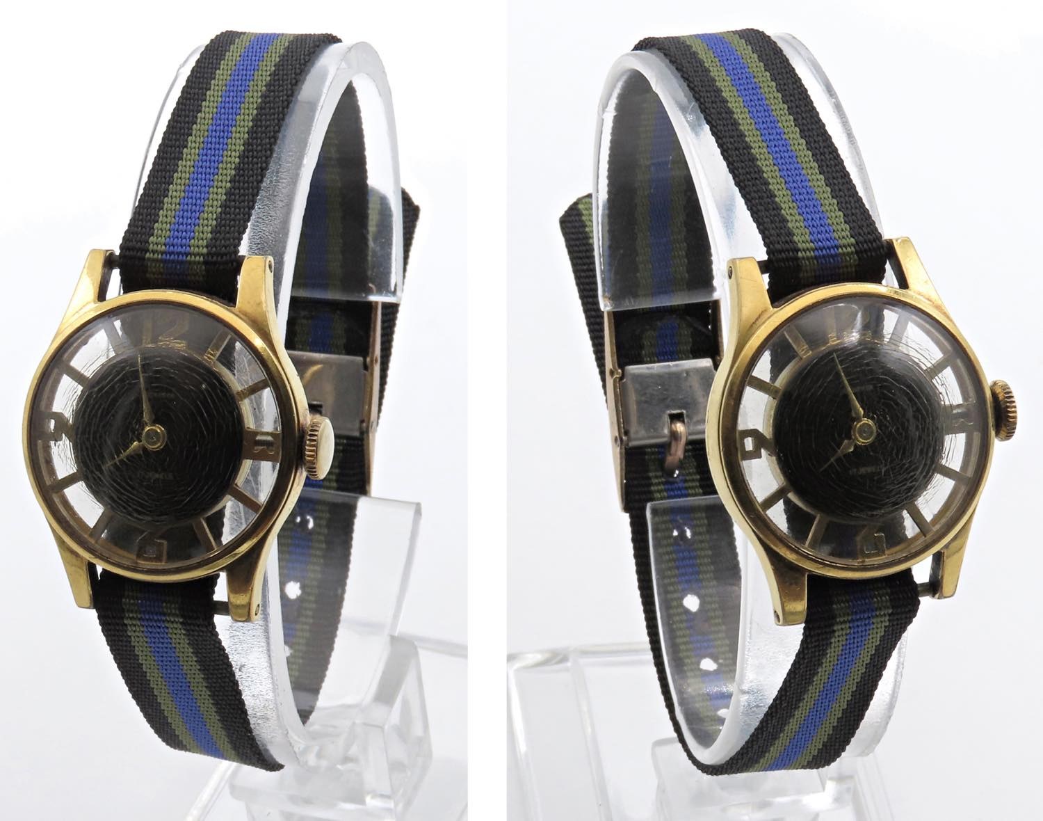 BUCHERER Semi- scheletrato. Movimento a carica manuale. Cassa laminata in oro con diametro da 25 mm. Dial nero. Anni ' 60. Funzionante revisione consigliata. Selezione "Brutti Anatroccoli" - "Brutti Anatroccoli" selection www.bruttianatroccoli.it