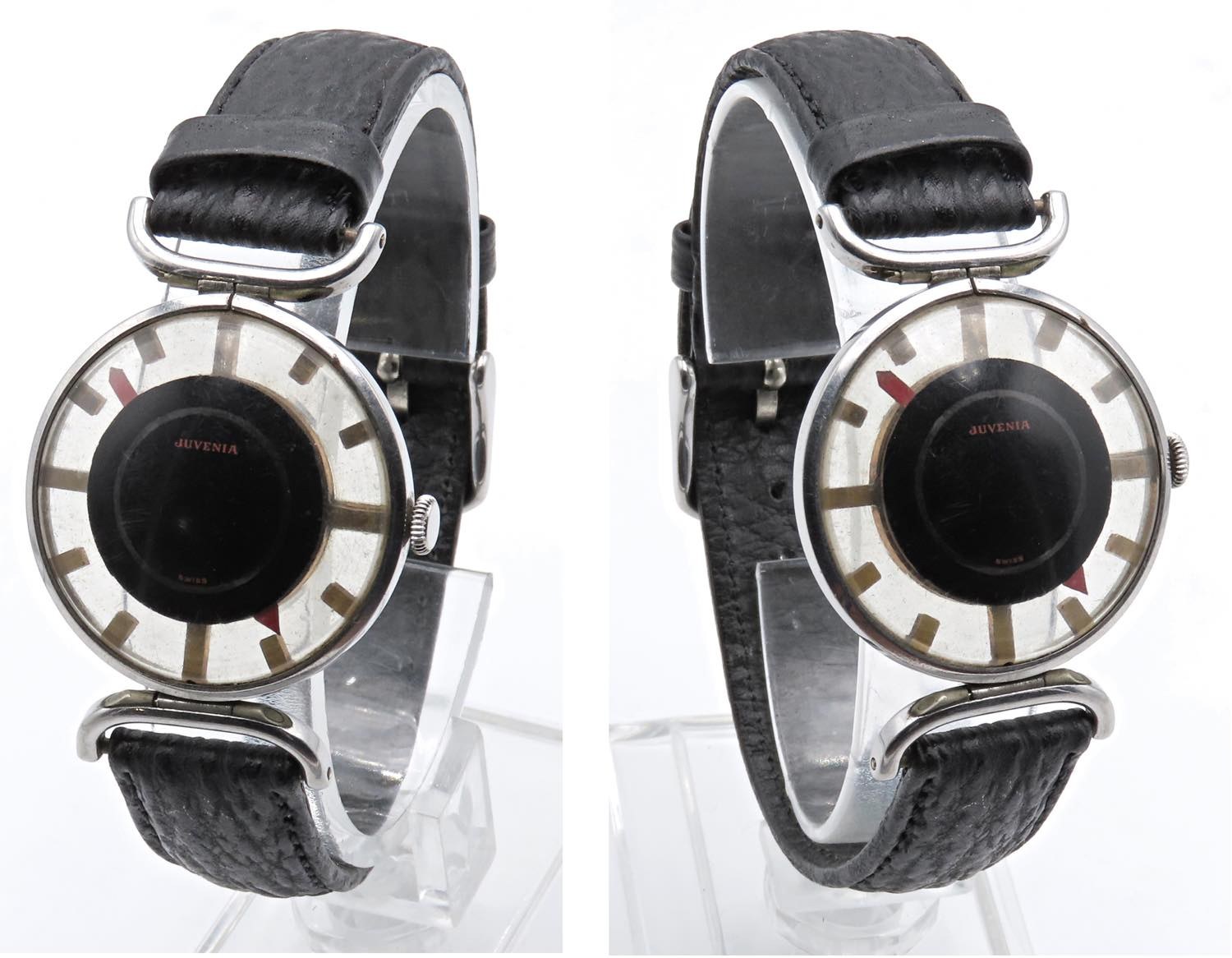 JUVENIA MYSTÈRE. Movimento a carica manuale, cassa in metallo con diametro da 31 mm. Dial nero. Orologio scheletrato. Anse a semi-luna. Anni '60. Funzionante, revisione consigliata. Selezione "Brutti Anatroccoli" - "Brutti Anatroccoli" selection www.bruttianatroccoli.it