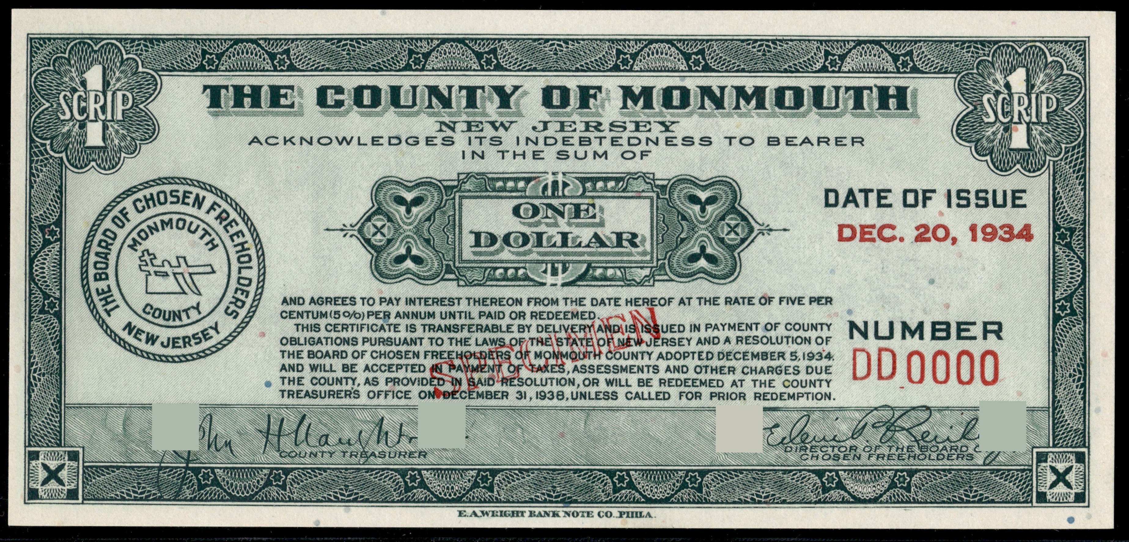 United States of America. Monmouth Scrip 1 Dollar 1934 Specimen E.A. Wright Bank Note Co.. Phila.