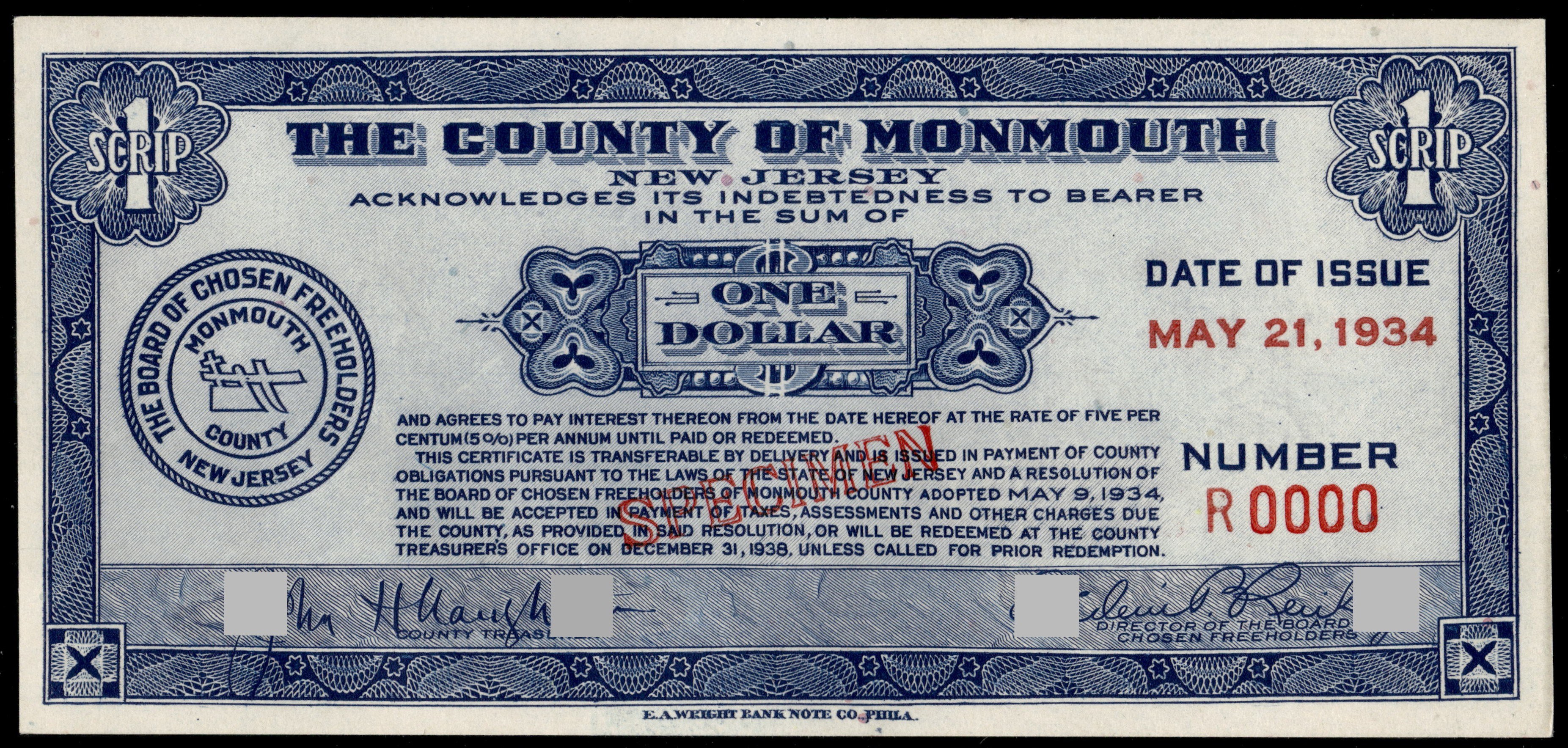 United States of America. Monmouth Scrip 1 Dollar 1934 Specimen E.A. Wright Bank Note Co.. Phila.